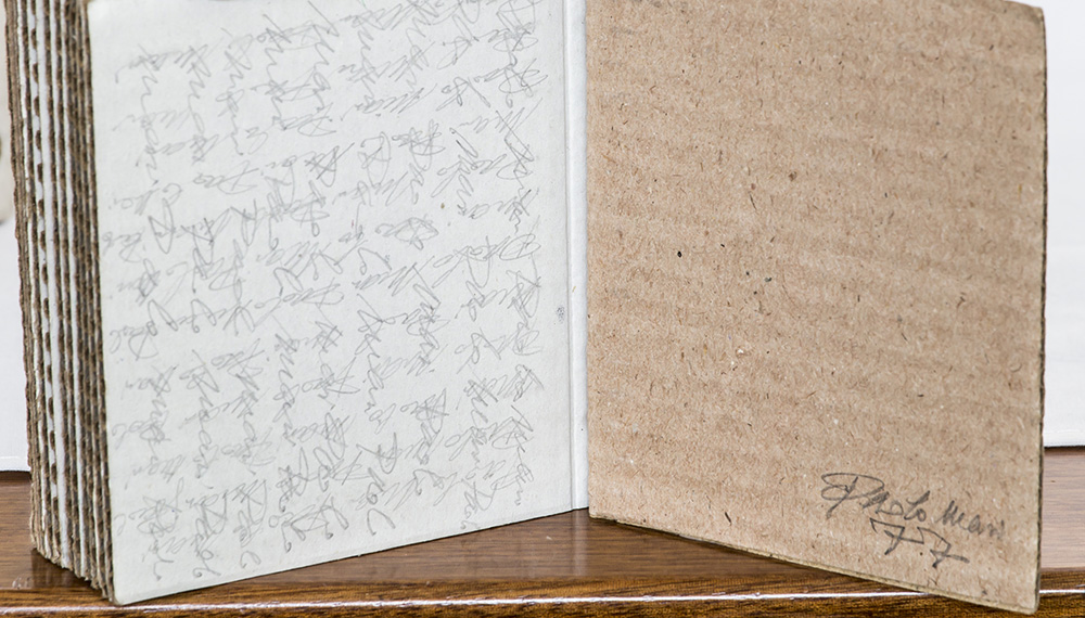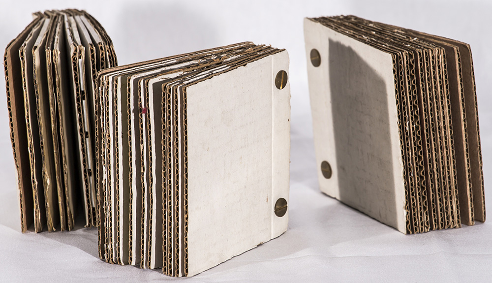 Lotto unico di tre opere. Ogni opera è un “libro” composto da vari strati di cartone rilegati e recanti interventi a pastello, tecnica mista e collage