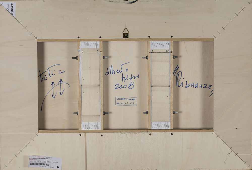 Firma, datazione, titolo e timbro dello studio dell'Artista con relativo numero di archiviazione al retro