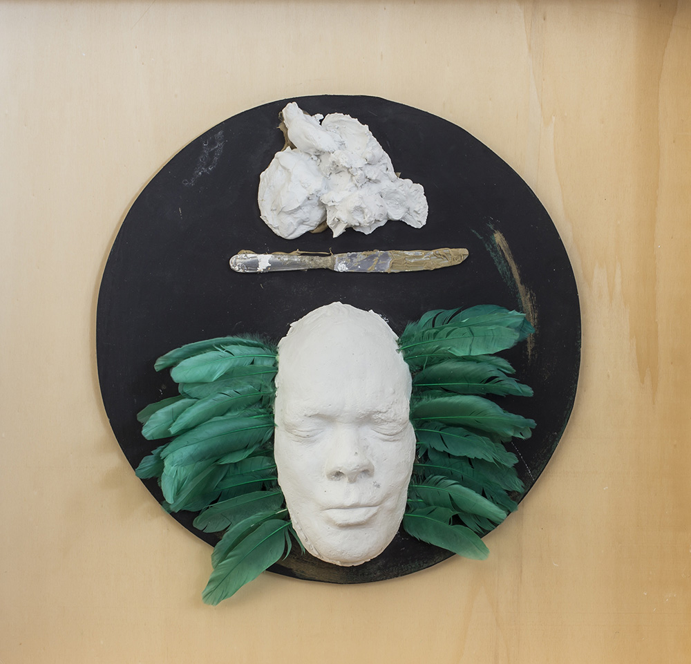 Acrilici su tavola, gesso, coltello, colla e piume in teca di legno e vetro