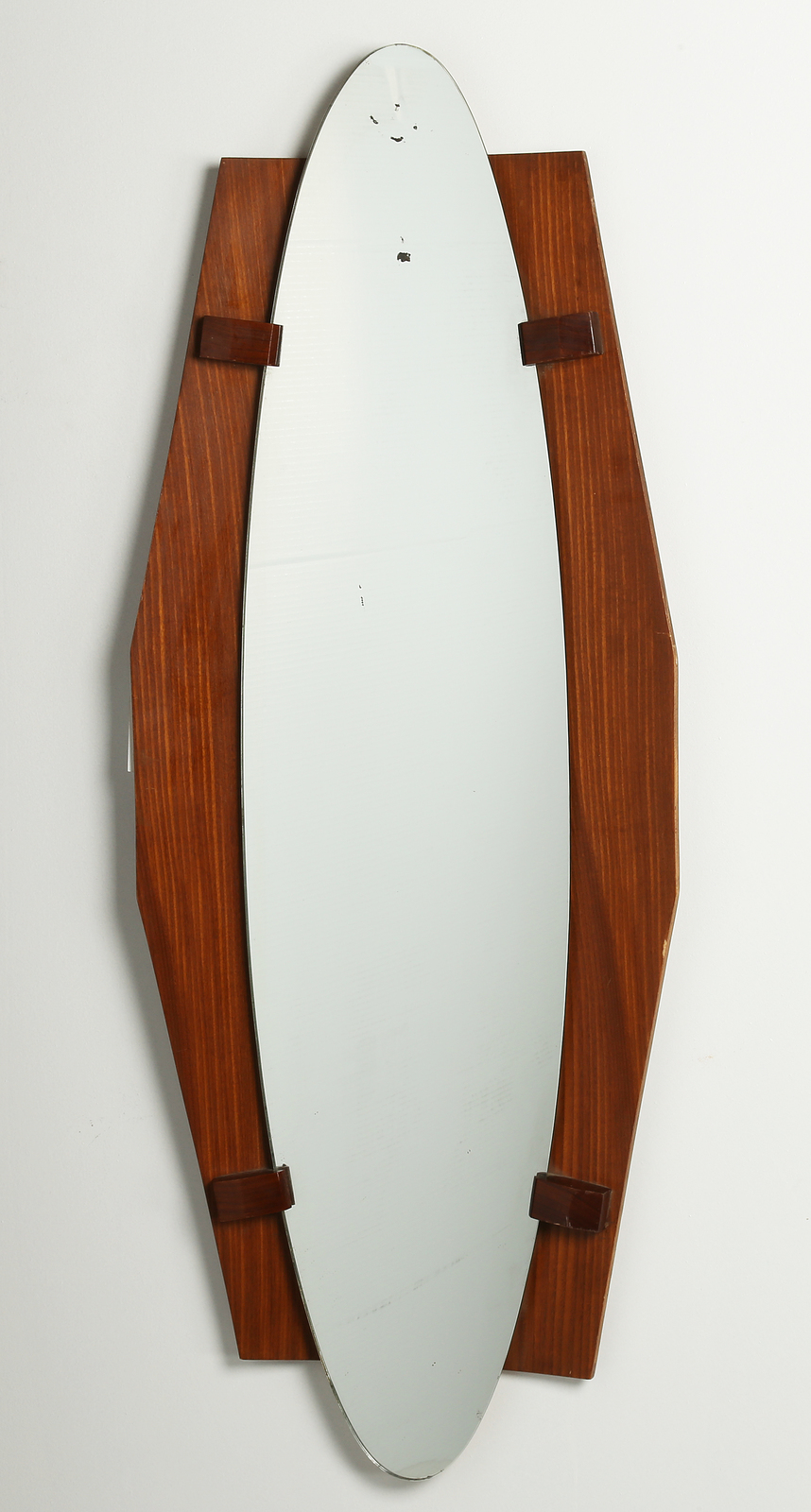 MANIFATTURA ITALIANA Specchio su tavola in legno di teak, anni 60. . Cm 38,00 x 99,00 x 4,50.