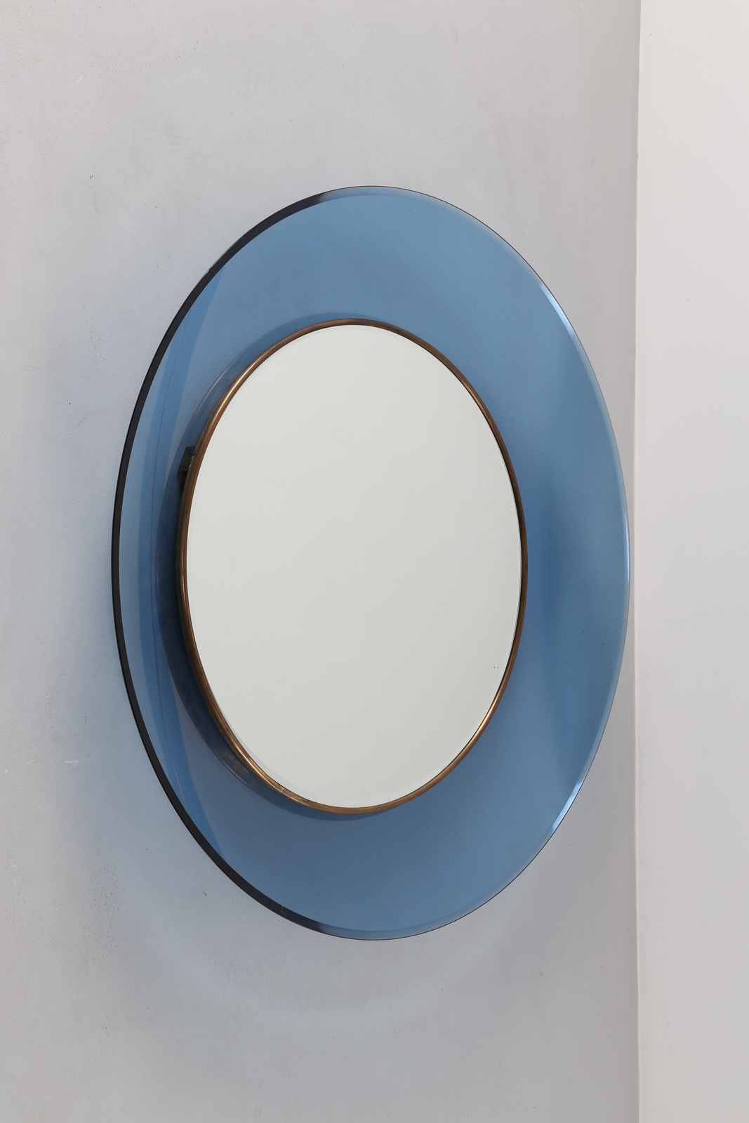 INGRAND MAX (1908 - 1969) Specchio in cristallo colorato blu curvato molato e ottone mod. 1669, per Fontana Arte, anni 60. Pubblicazioni; L.Falconi Fontana Arte, una storia trasparente, Skira, 1998, pag. 111. Franco Deboni, Fontana Arte, Allemandi 2012, fig. 419 . -. Cm 75,00 x 75,00 x 9,00.