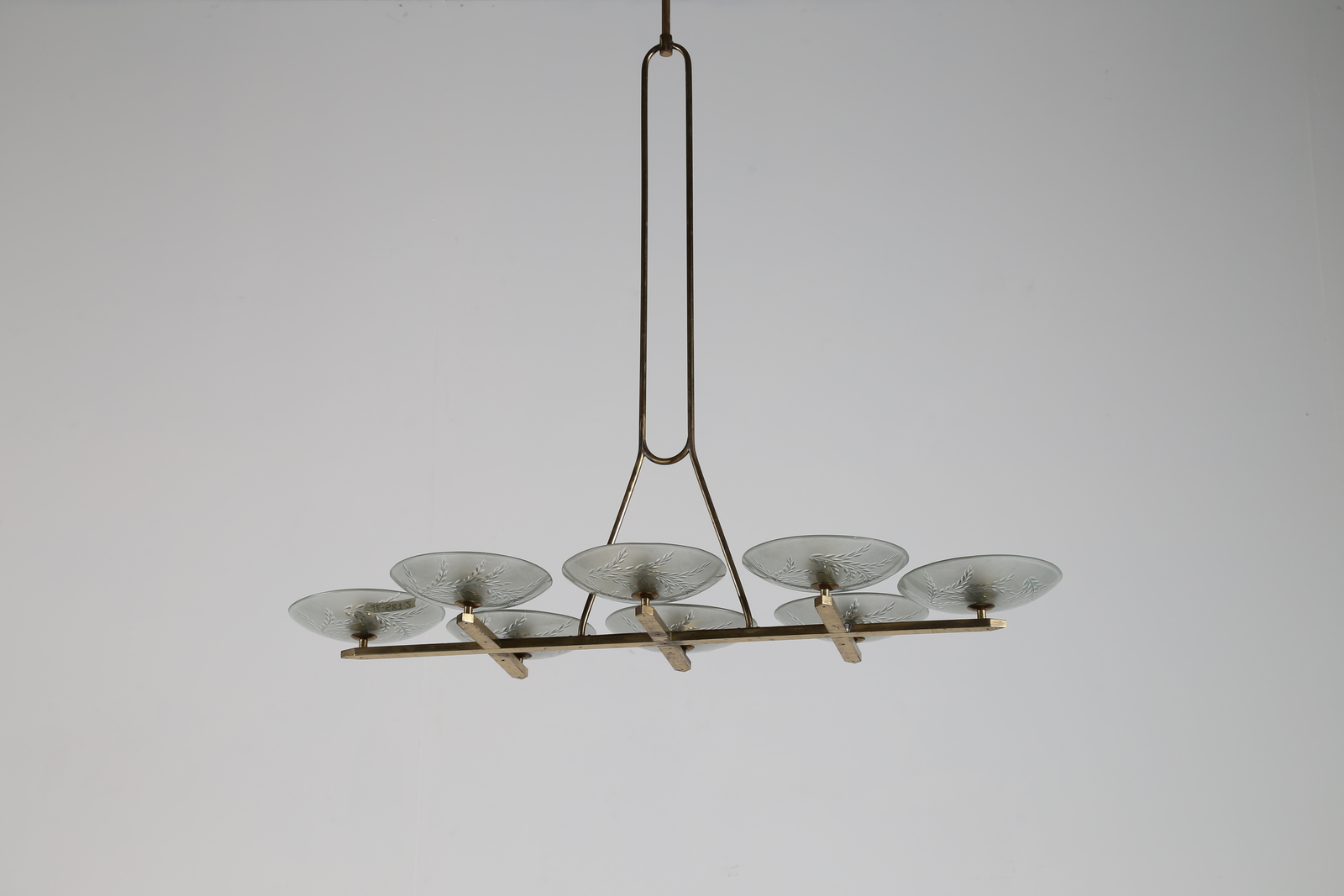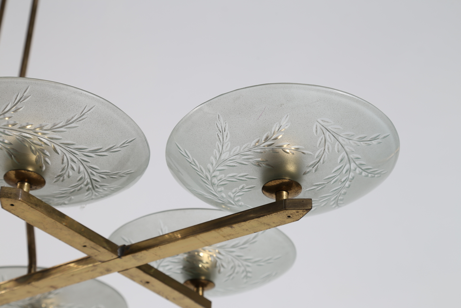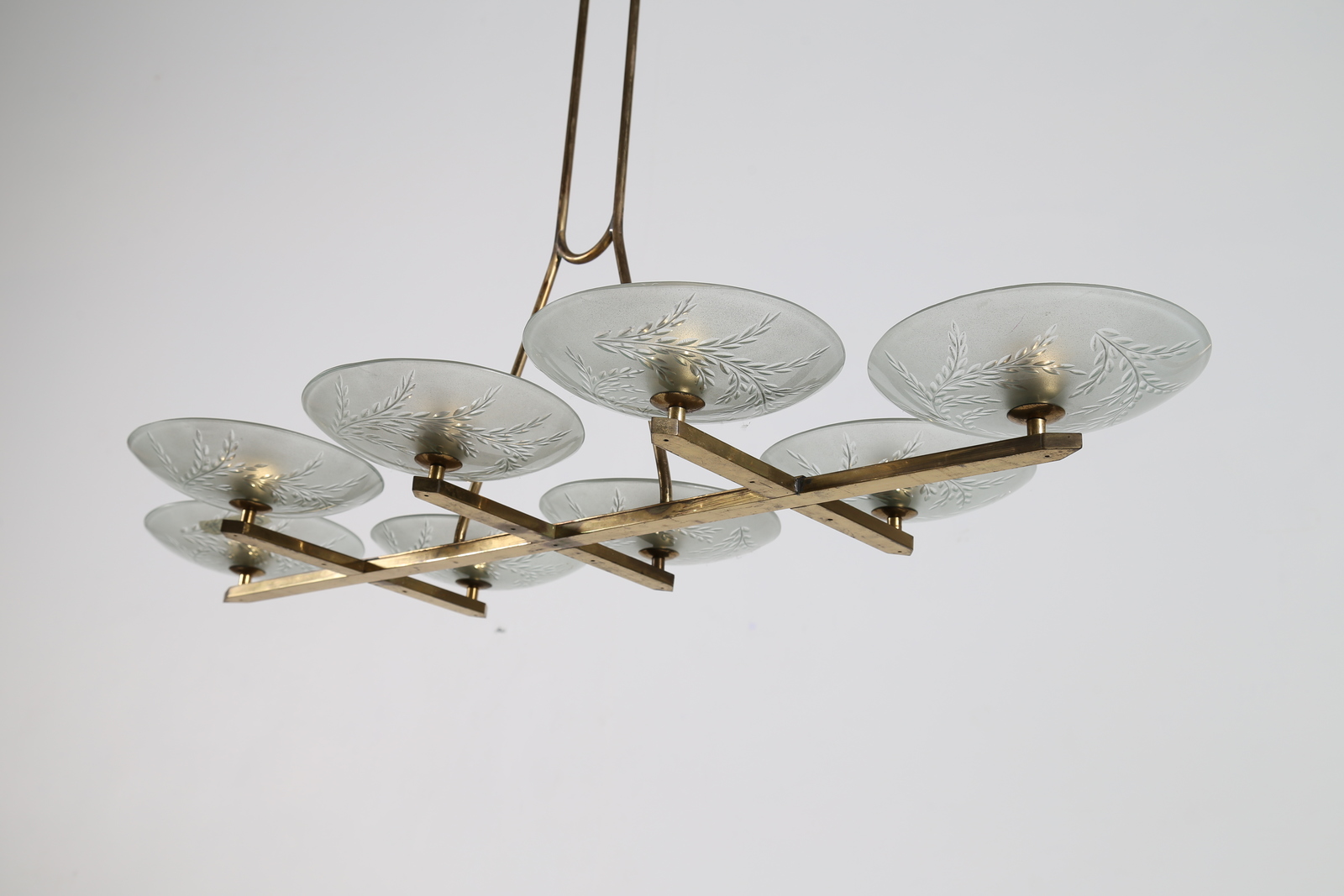 BRUSOTTI LUIGI Lampada a sospensione in ottone e vetro inciso, anni 50. Ottone e vetro. Cm 110,00 x 178,00 x 49,00.