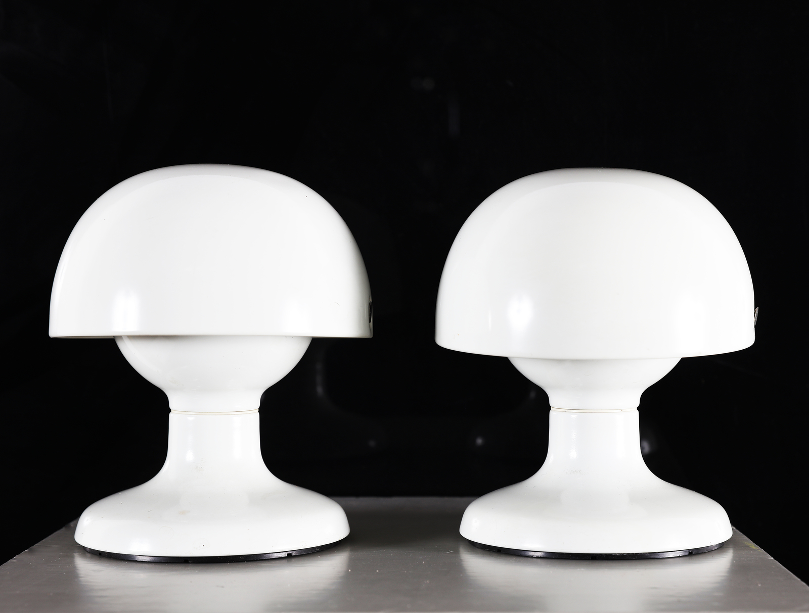 SCARPA AFRA & TOBIA Due lampade da tavolo in metallo laccato bianco, mod. Jucker, per Flos, anni 60. Metallo laccato. Cm 18,00 x 21,00 x 18,00. Etichetta presente