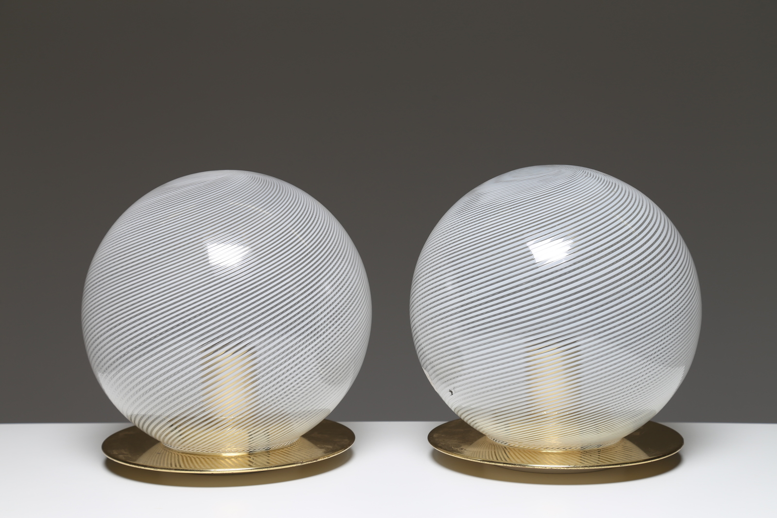 VENINI Coppia lampade da tavolo in ottone e vetro serie tessuto, anni 60. -....