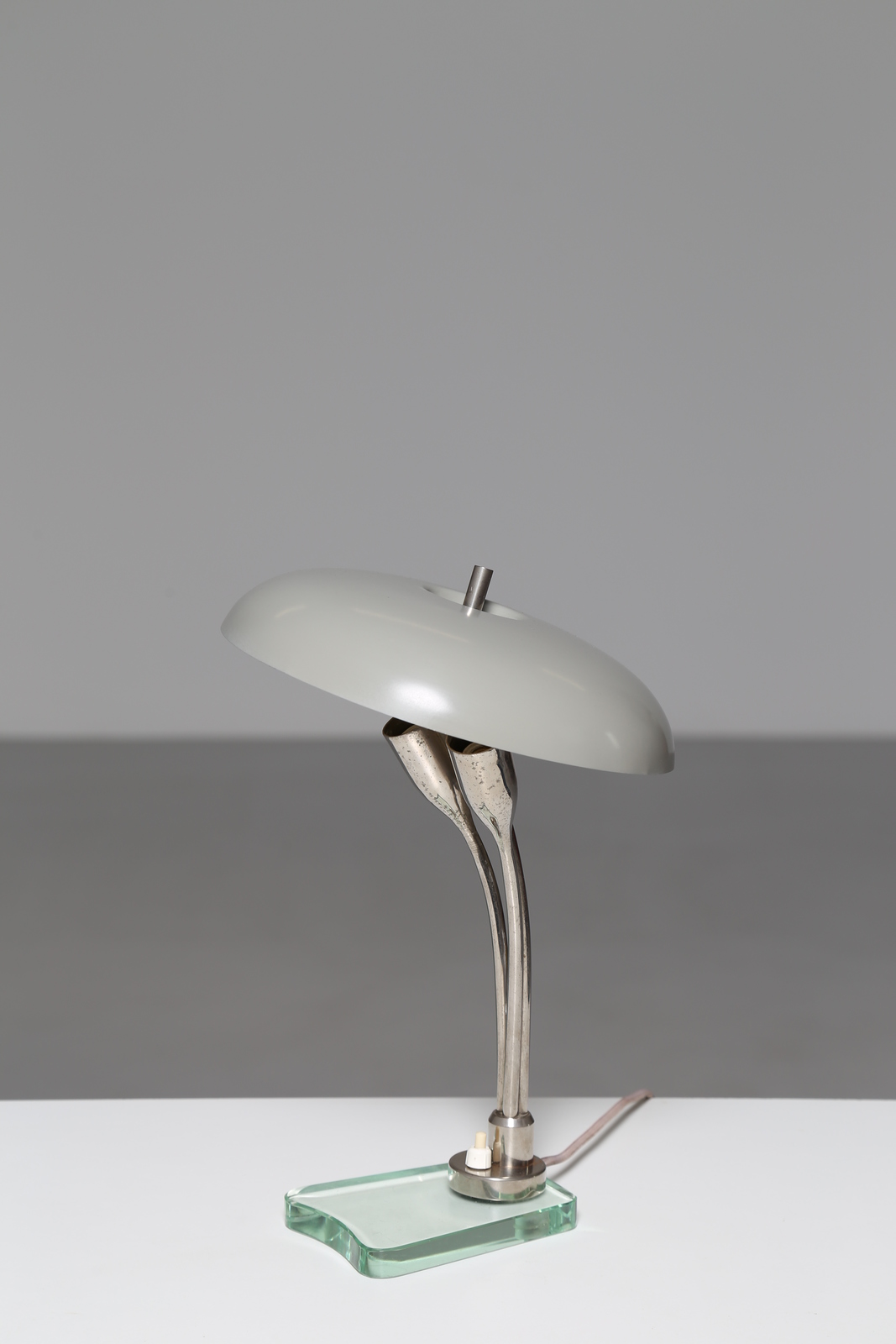 FONTANA ARTE Attrib. Lampada da tavolo in metallo e ottone con base in vetro, per Fontana Arte, 1950. Metallo, vetro e ottone. Cm 24,00 x 33,00 x 24,00.