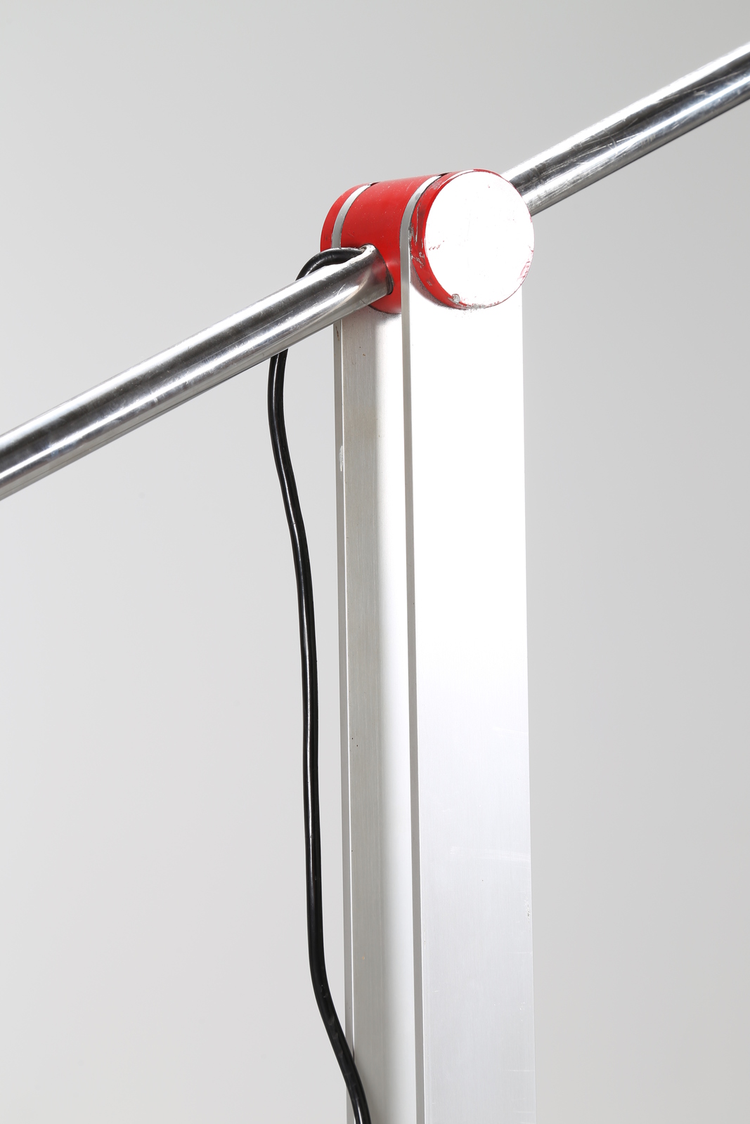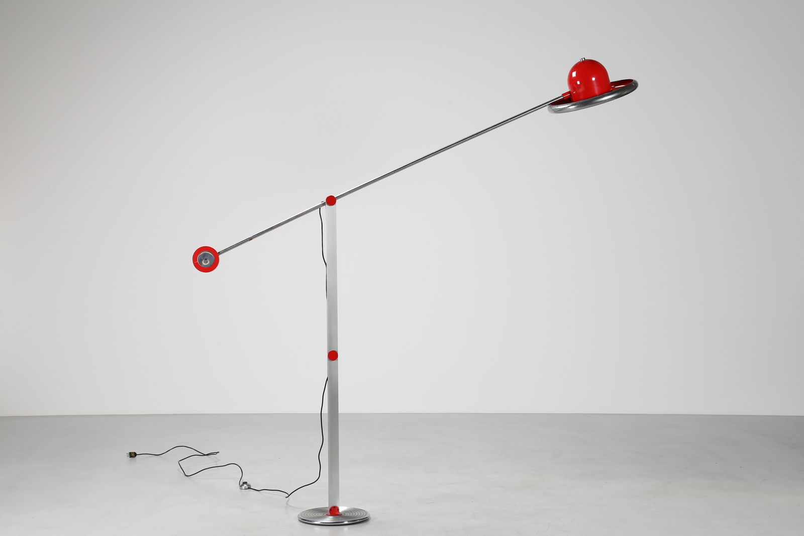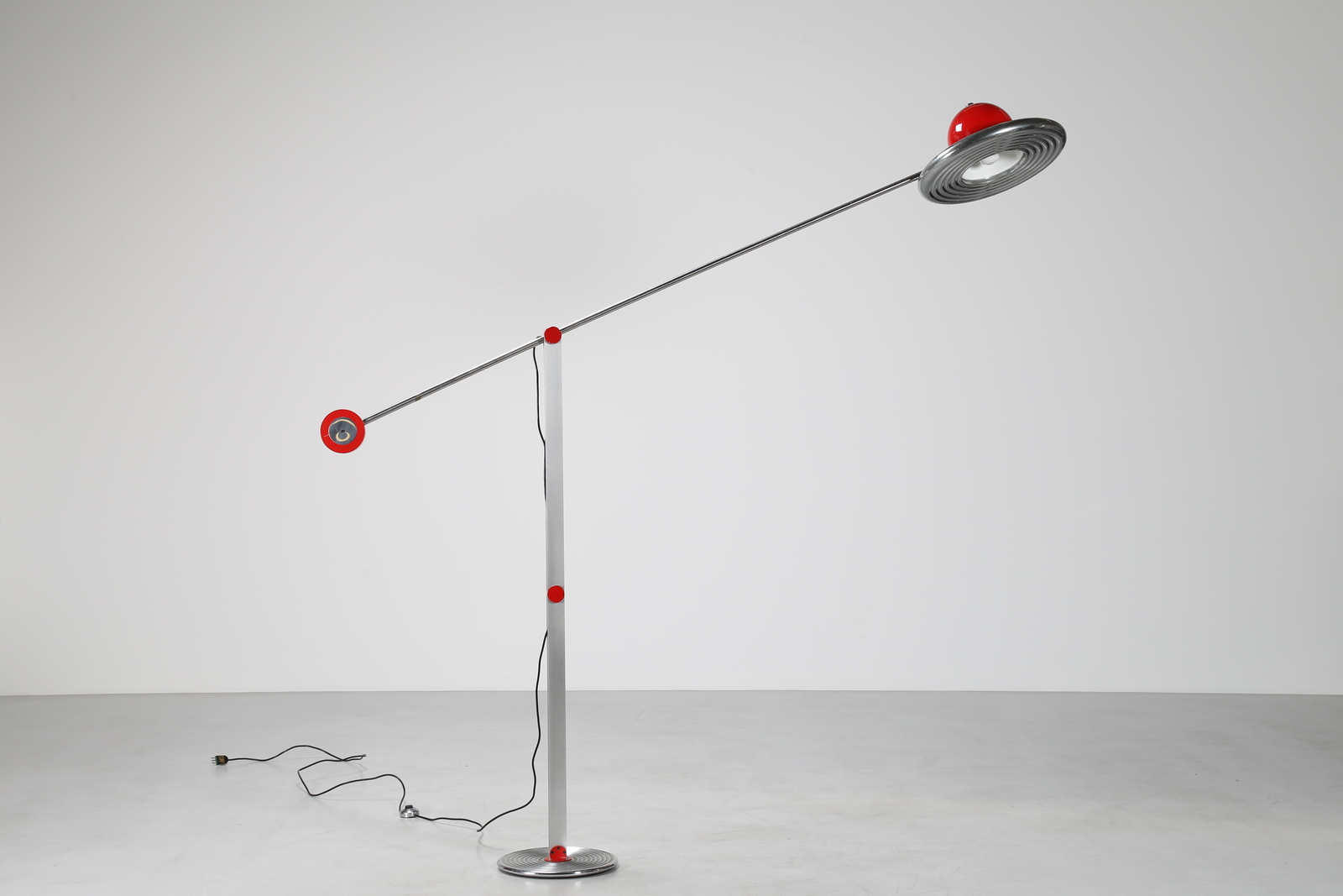 VALENTI Lampada da terra in metallo cromato e laccato rosso, mod. Bilancia, anni 70. -. Cm 235,00 x 240,00 x 45,00.