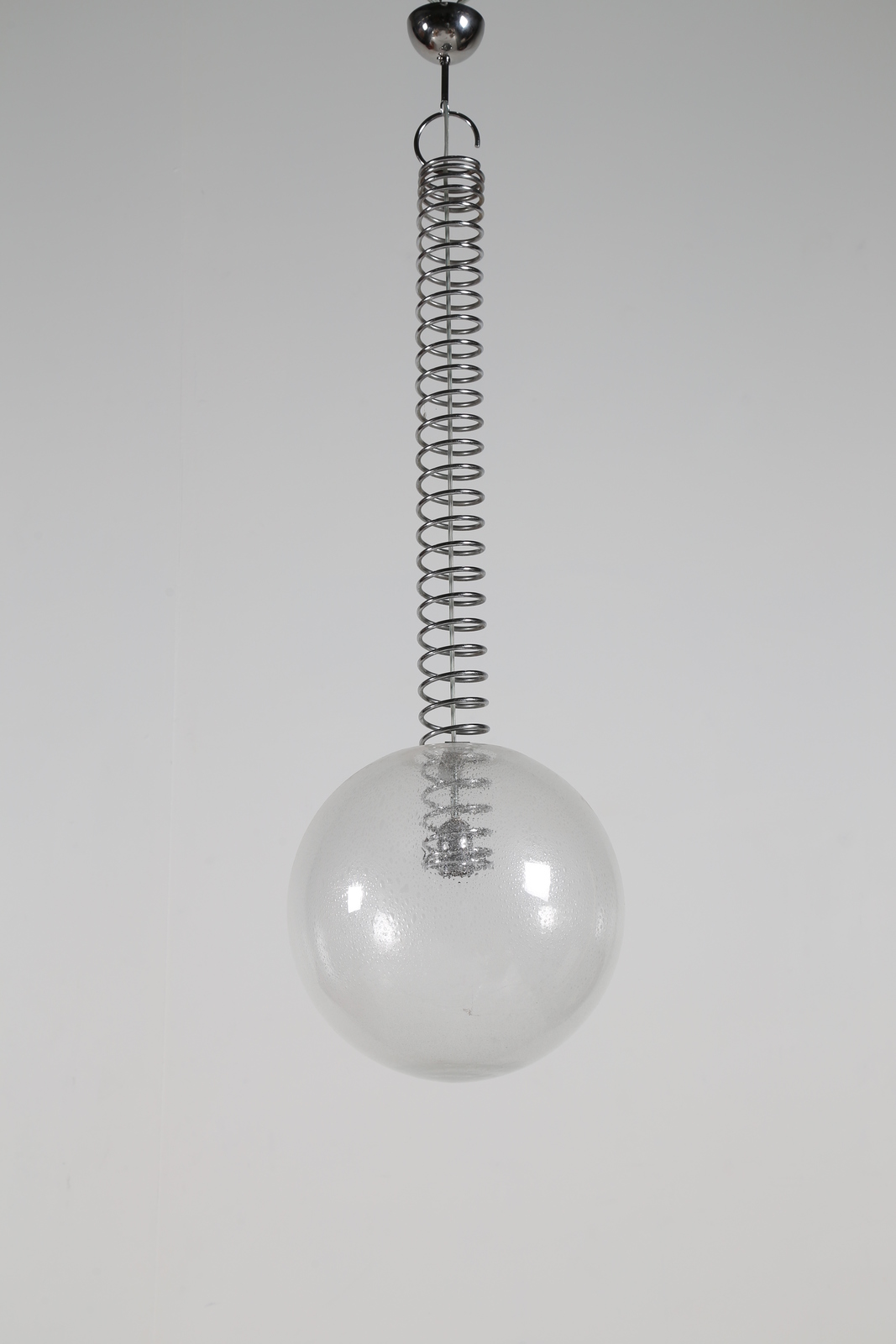 MANIFATTURA ITALIANA Lampada a sospensione in acciaio cromato e vetro, mod. Molla, anni 60°. -. Cm 38,00 x 135,00 x 38,00.