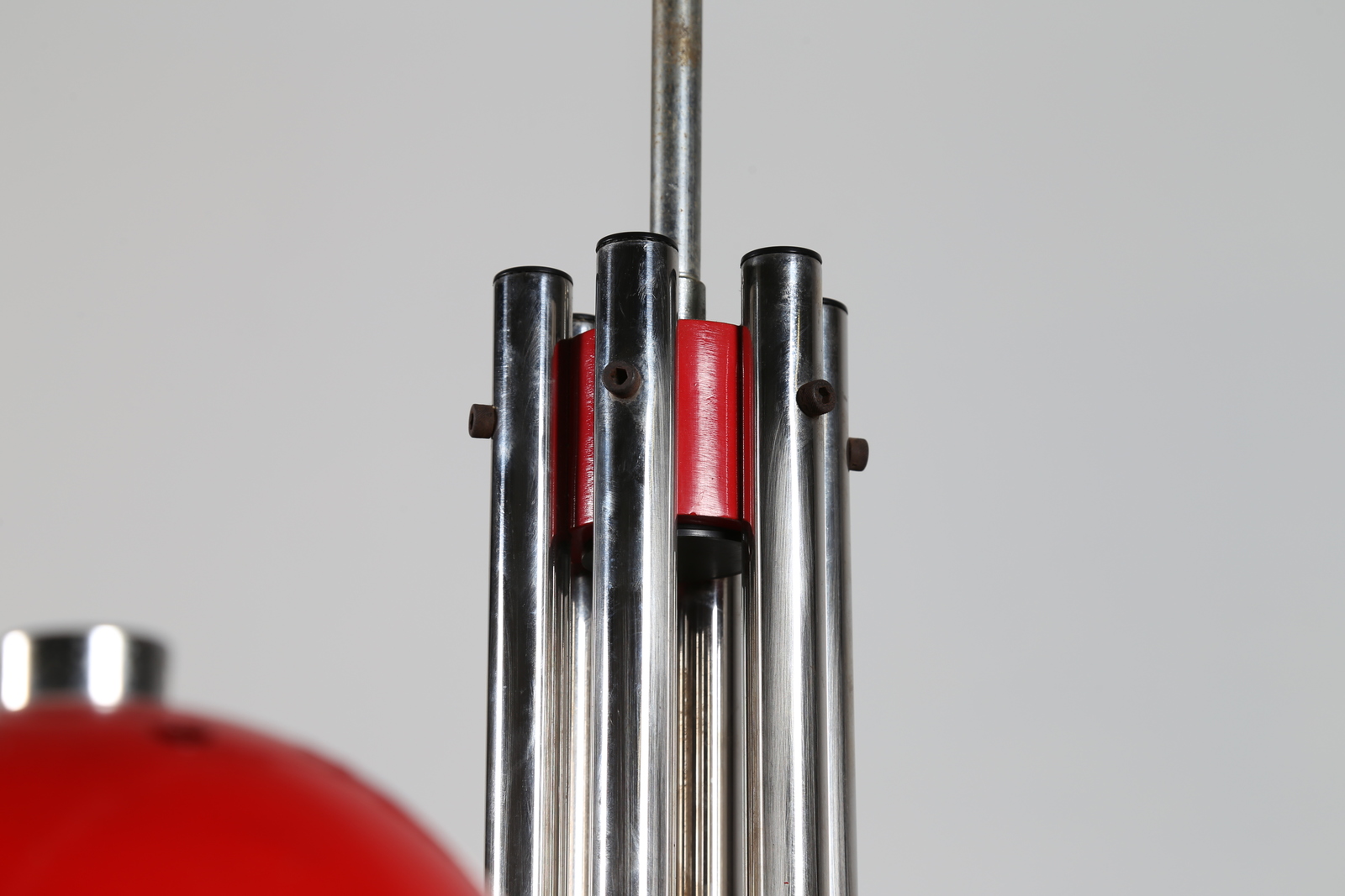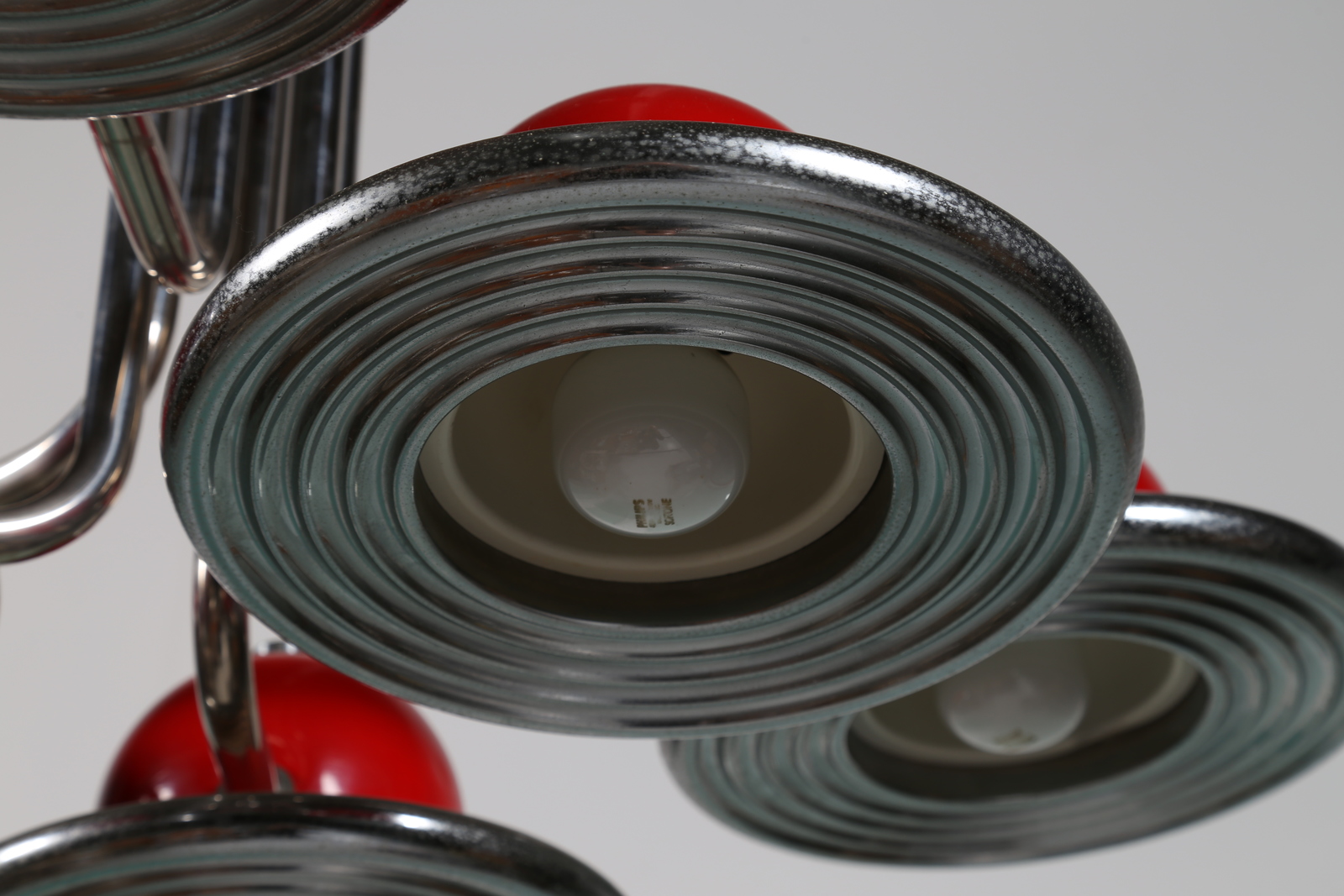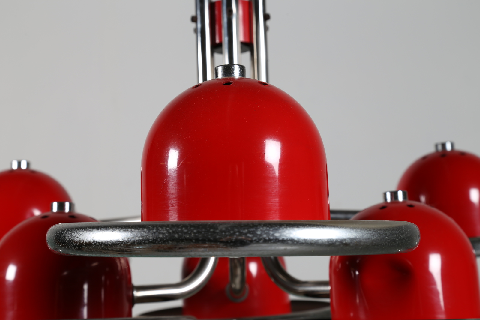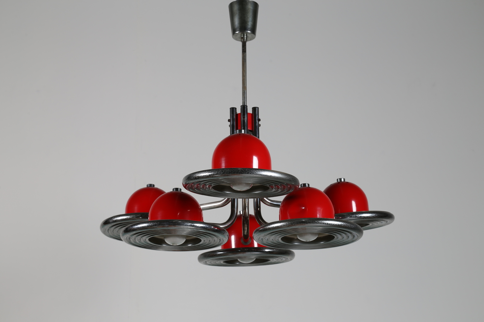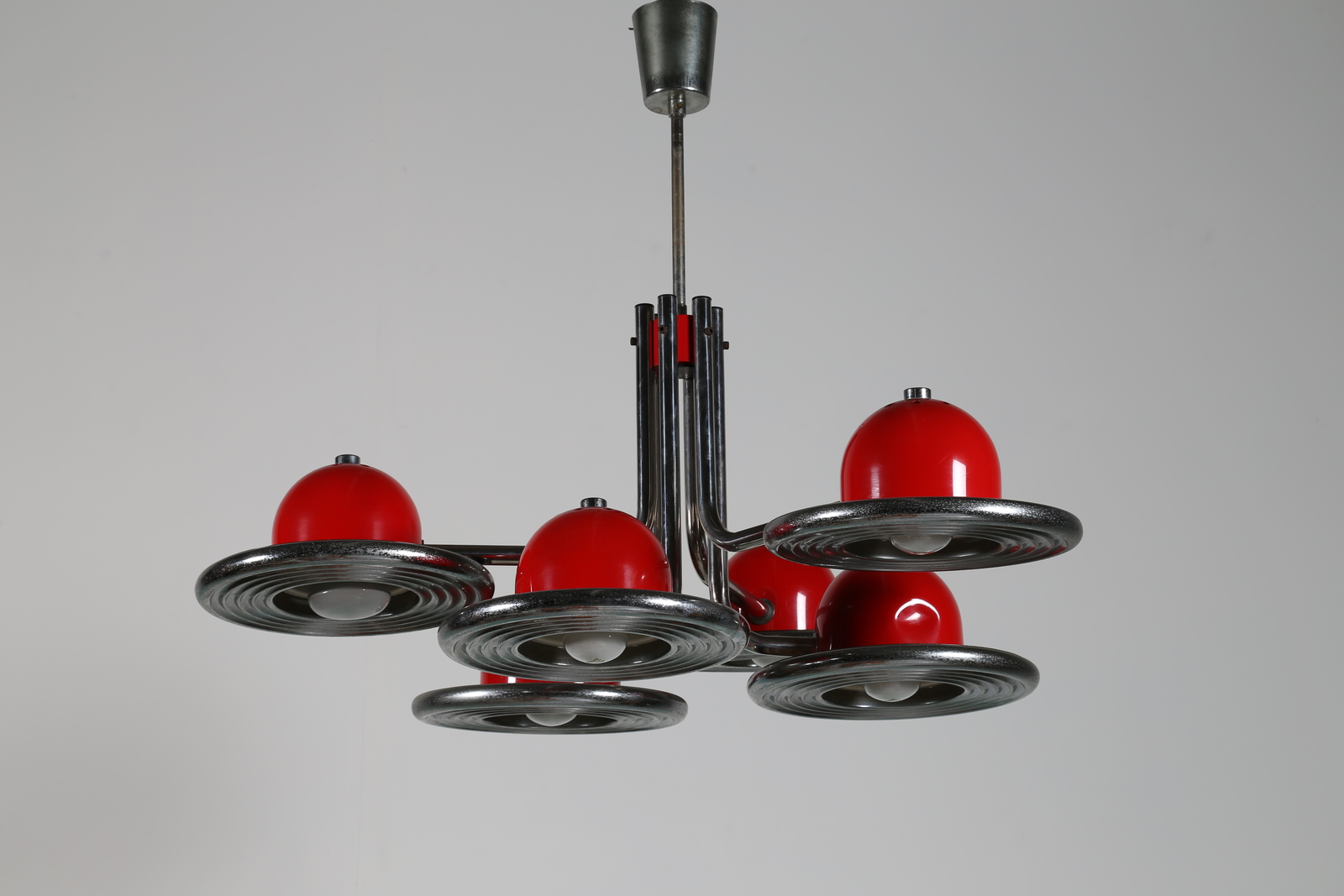 Lot 223 | VALENTI Lampadario in metallo cromato e laccato rosso, anni 70 . -. Cm 84,00...
