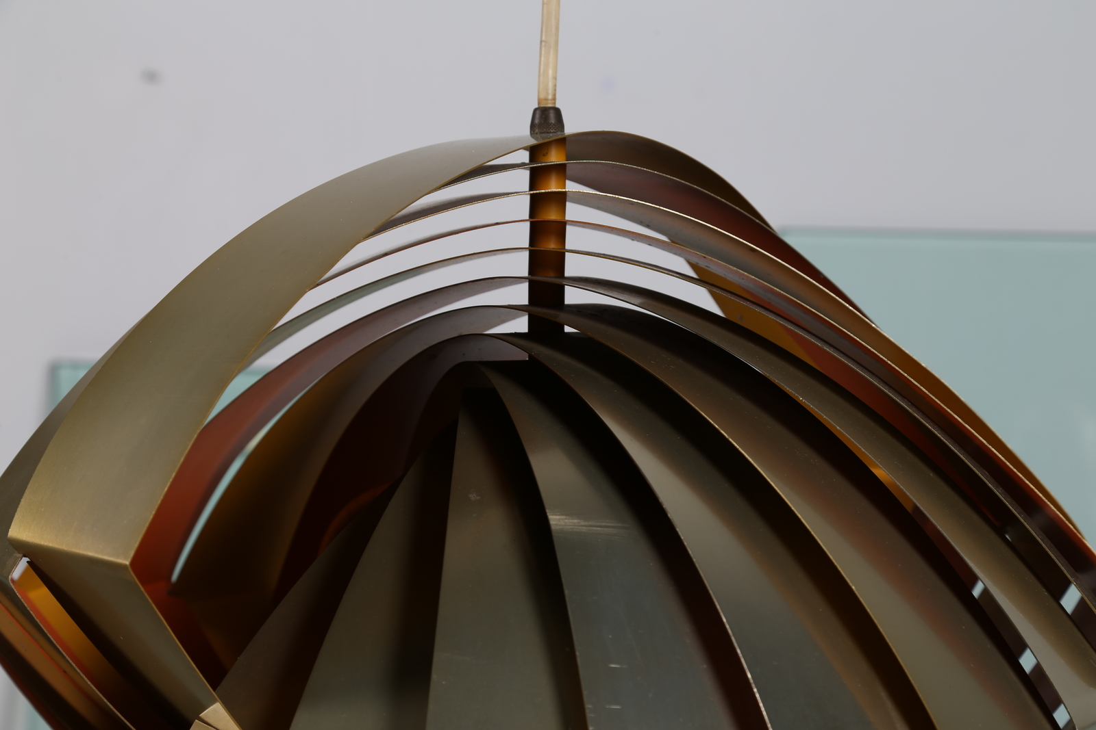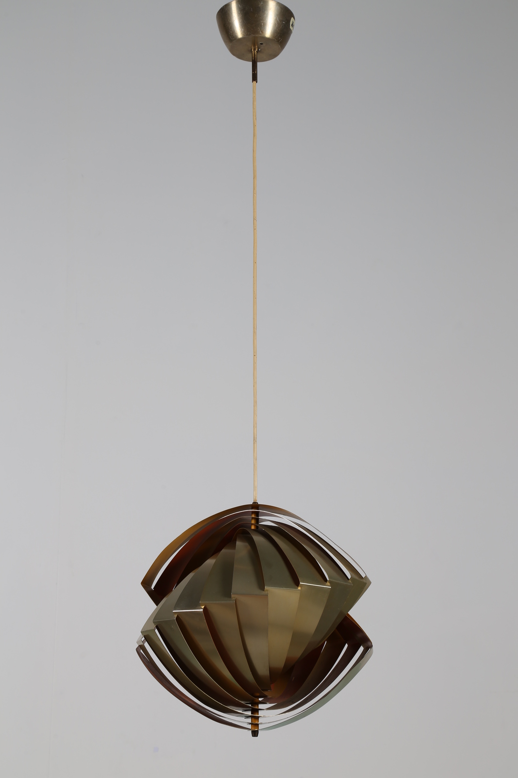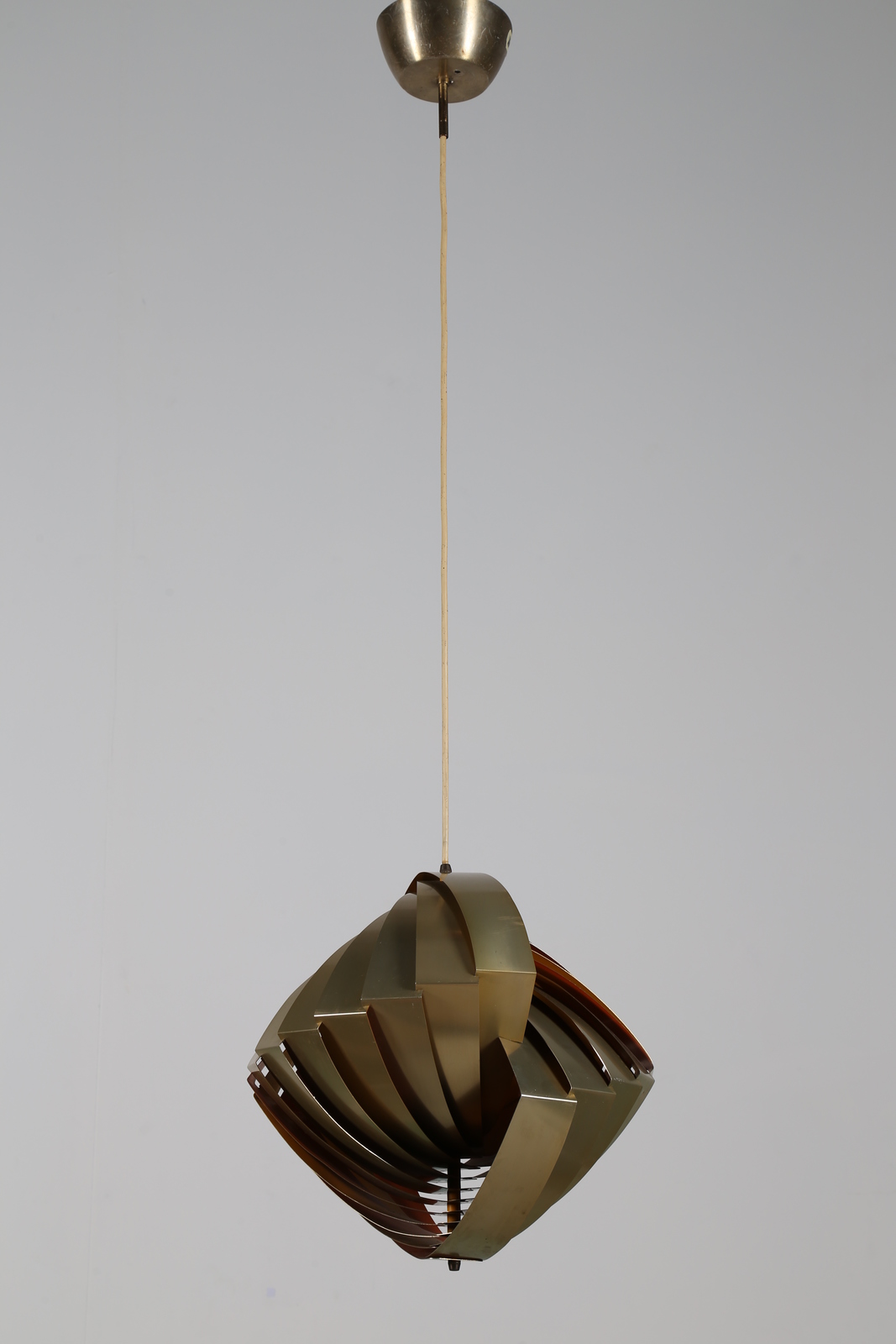 WEISDORF LOUIS Rara lampada a sospensione in lamelle di alluminio laccato e ottonato, per Lyfa, Danimarca anni 60. -. Cm 38,00 x 125,00 x 38,00.