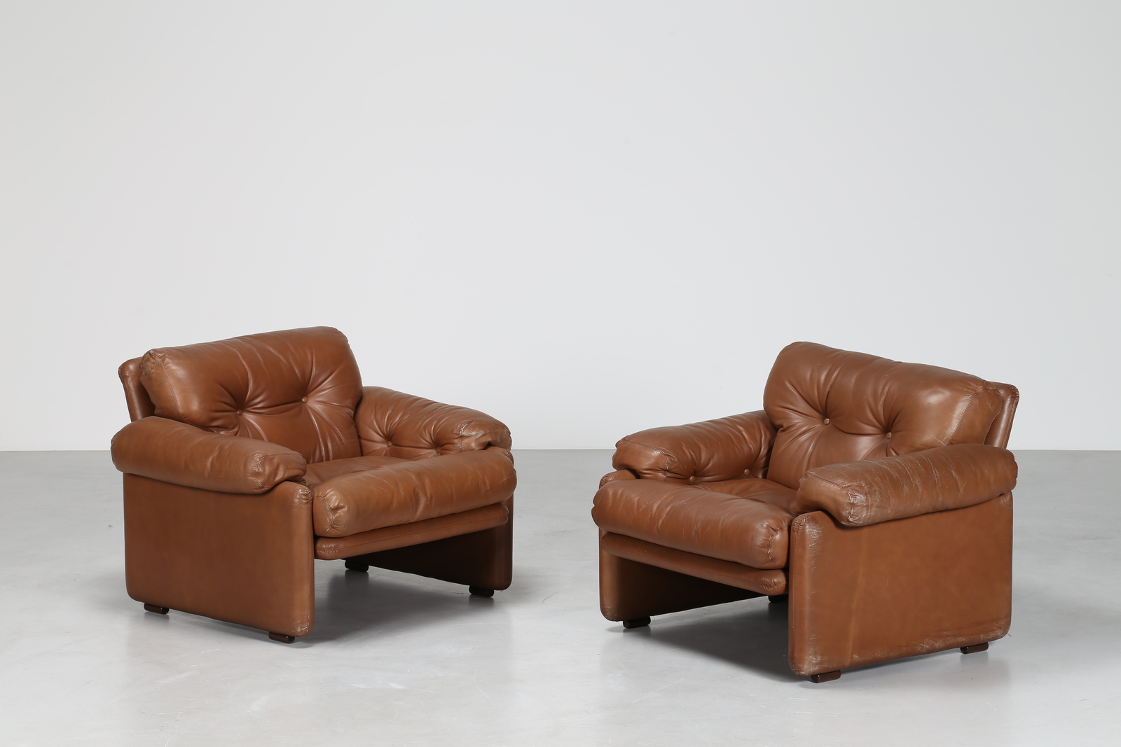 SCARPA TOBIA (n. 1935) Coppia di poltrone in legno con rivestimento in pelle, mod. Coronado Prod. B&B, Italia. Pelle. Cm 82,00 x 69,00 x 77,00. Etichetta presente