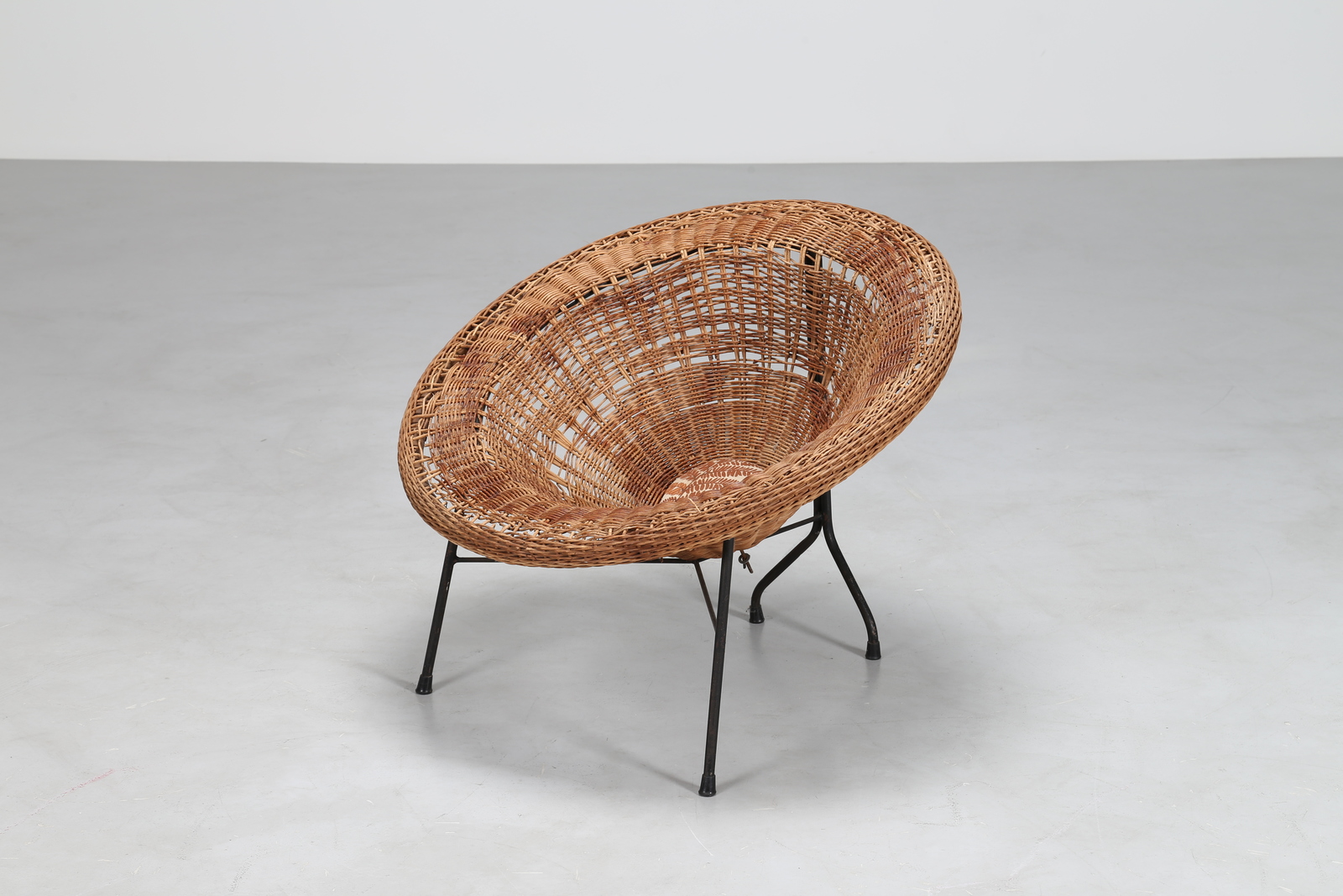 MANIFATTURA ITALIANA Poltroncina in tondino di ferro e rattan, mod. cesta, anni 60. . Cm 78,00 x 65,00 x 72,00.