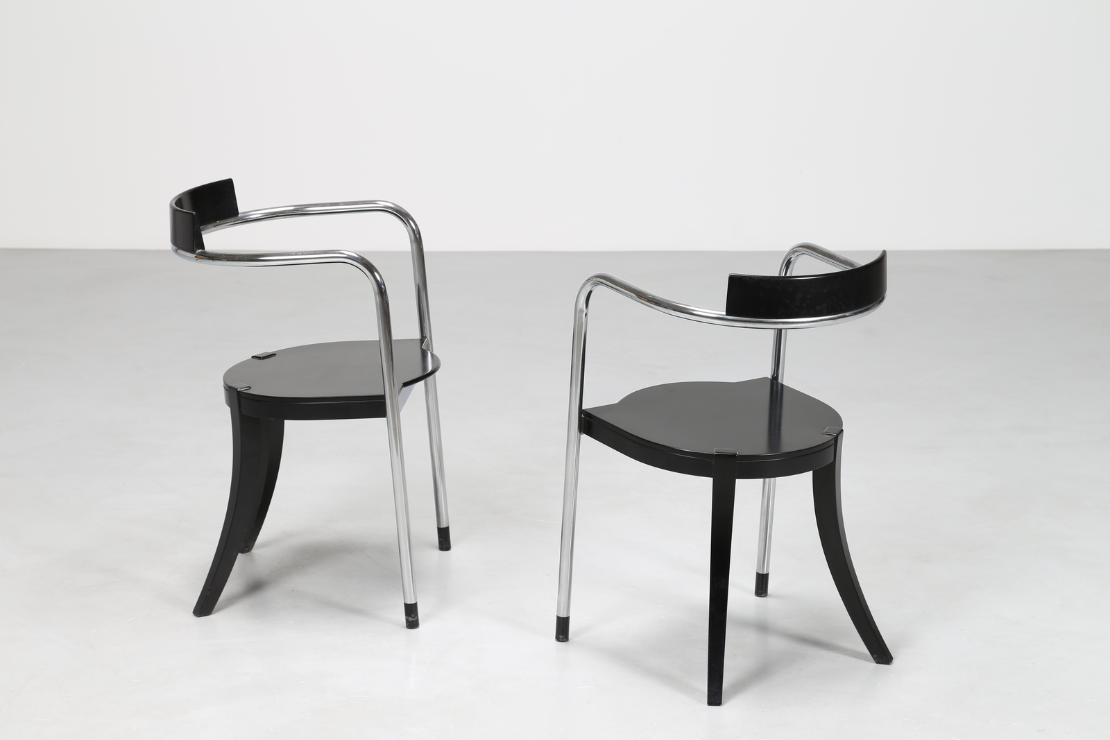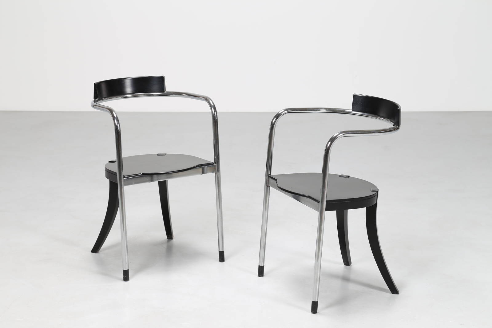 PALTERER DAVID Coppia sedie modello FAUNO, legno laccato nero e metallo cromato, per Zanotta, anni 80°. -. Cm 48,50 x 76,00 x 50,00.