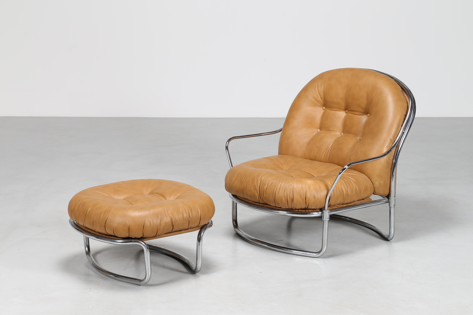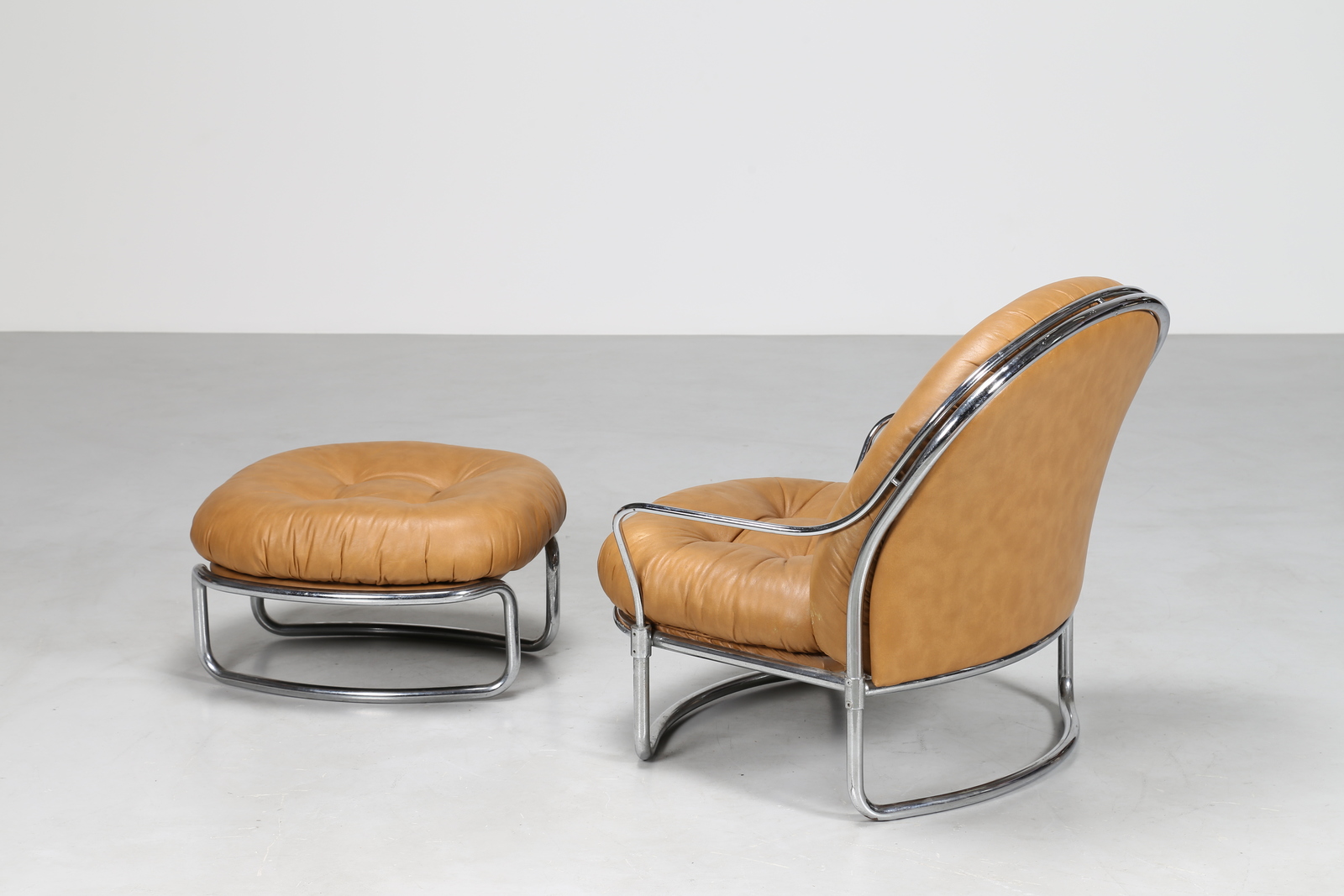 DE CARLI CARLO (1910 - 1999) Poltrona con pouf in tubolare cromato e cuscini...