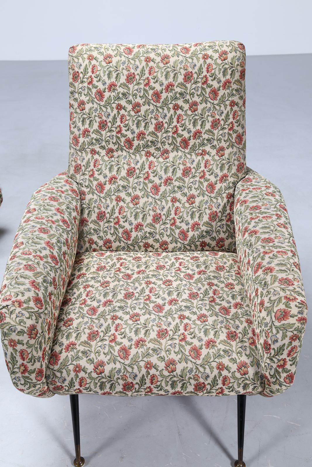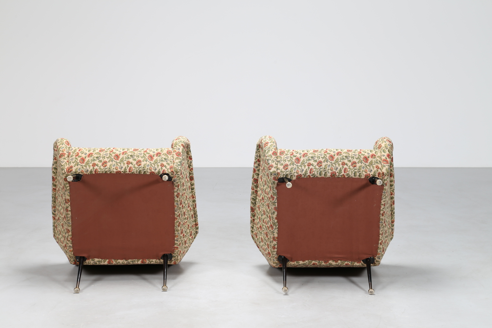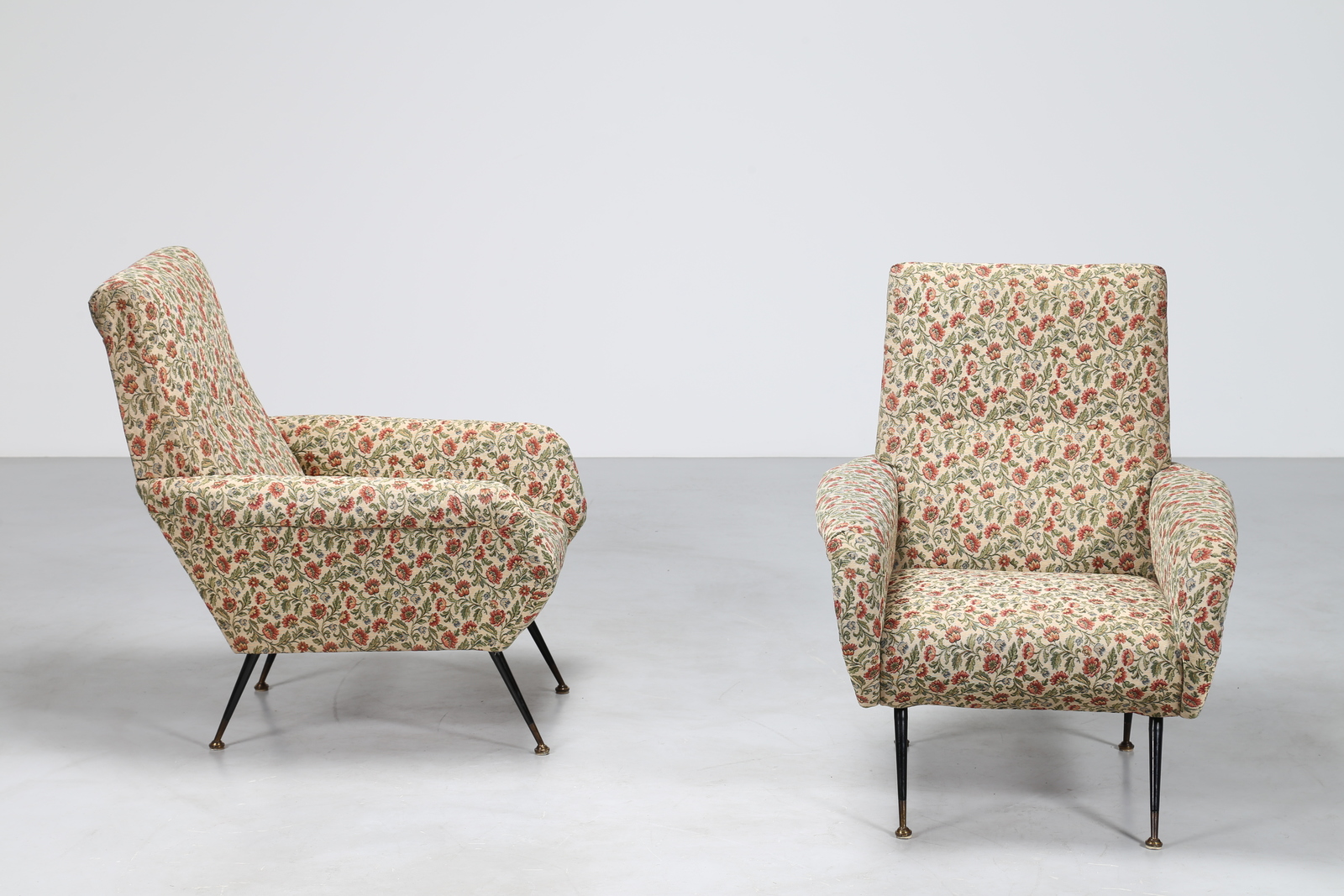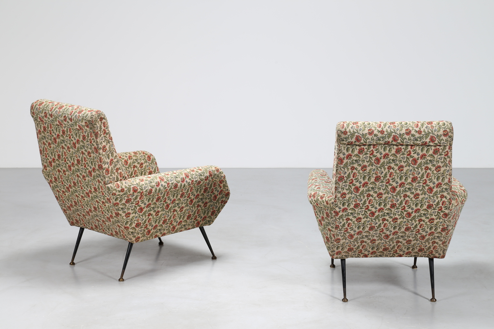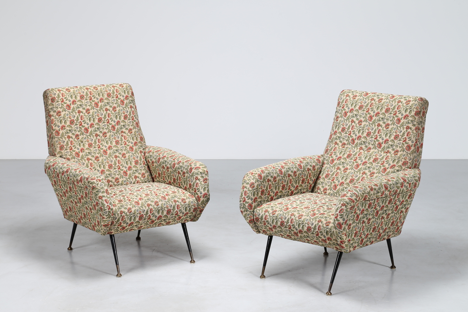 MANIFATTURA ITALIANA Coppia di poltrone in metallo laccato, ottone e tessuto a fiori, anni 50. -. Cm 79,00 x 93,00 x 90,00.