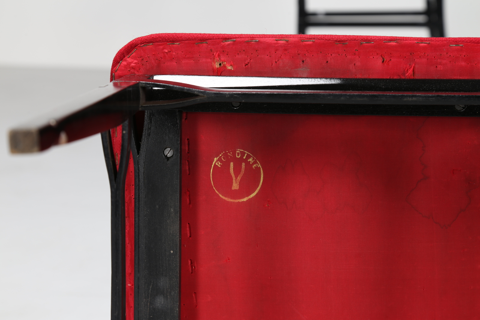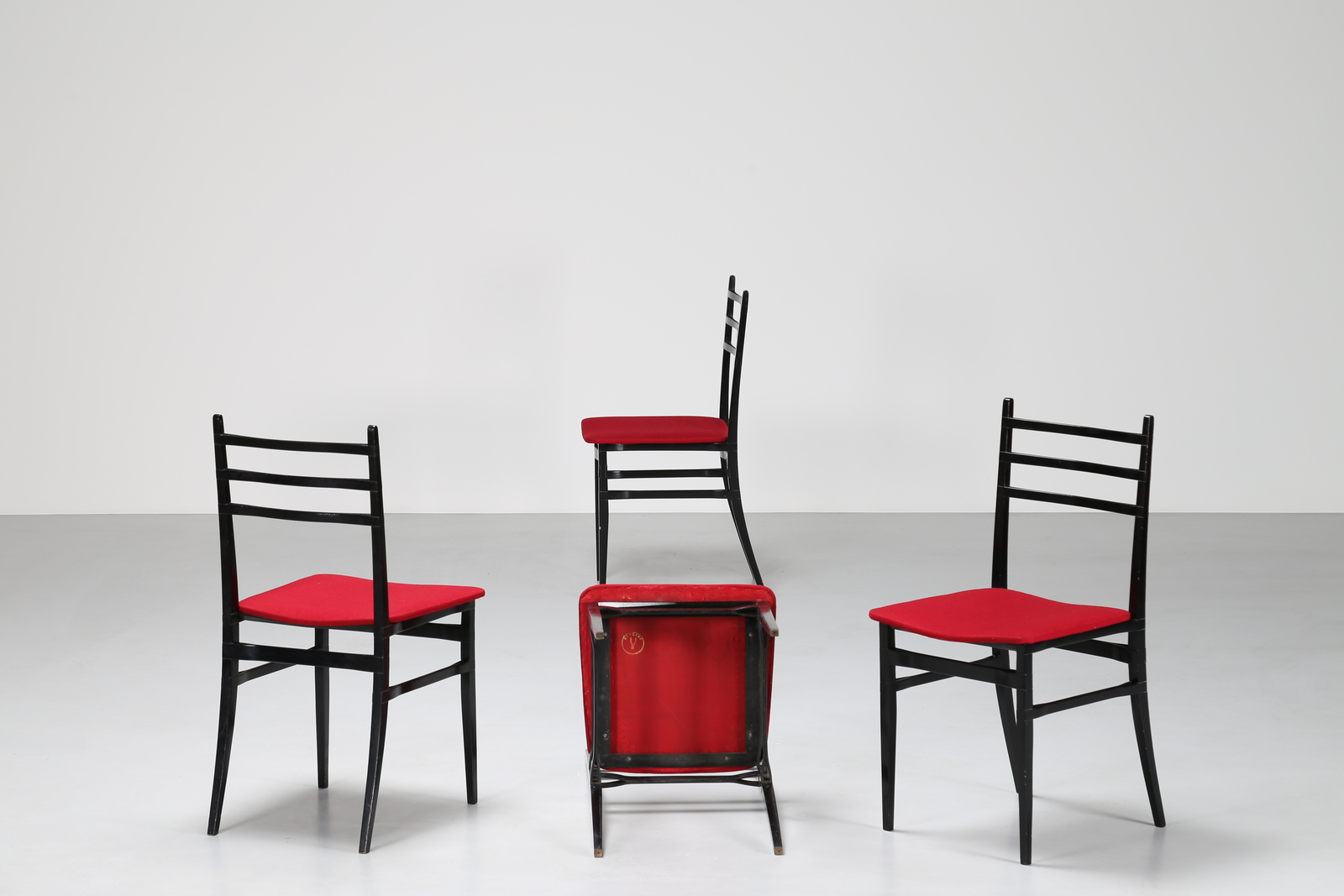 ULRICH GUGLIELMO Quattro sedie In legno laccato nero e tessuto, per Saffa, Trieste anni 60. 1961. . Cm 41,00 x 84,00 x 46,00. Marchio sotto la seduta