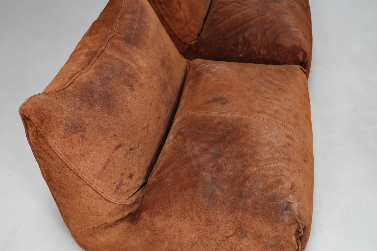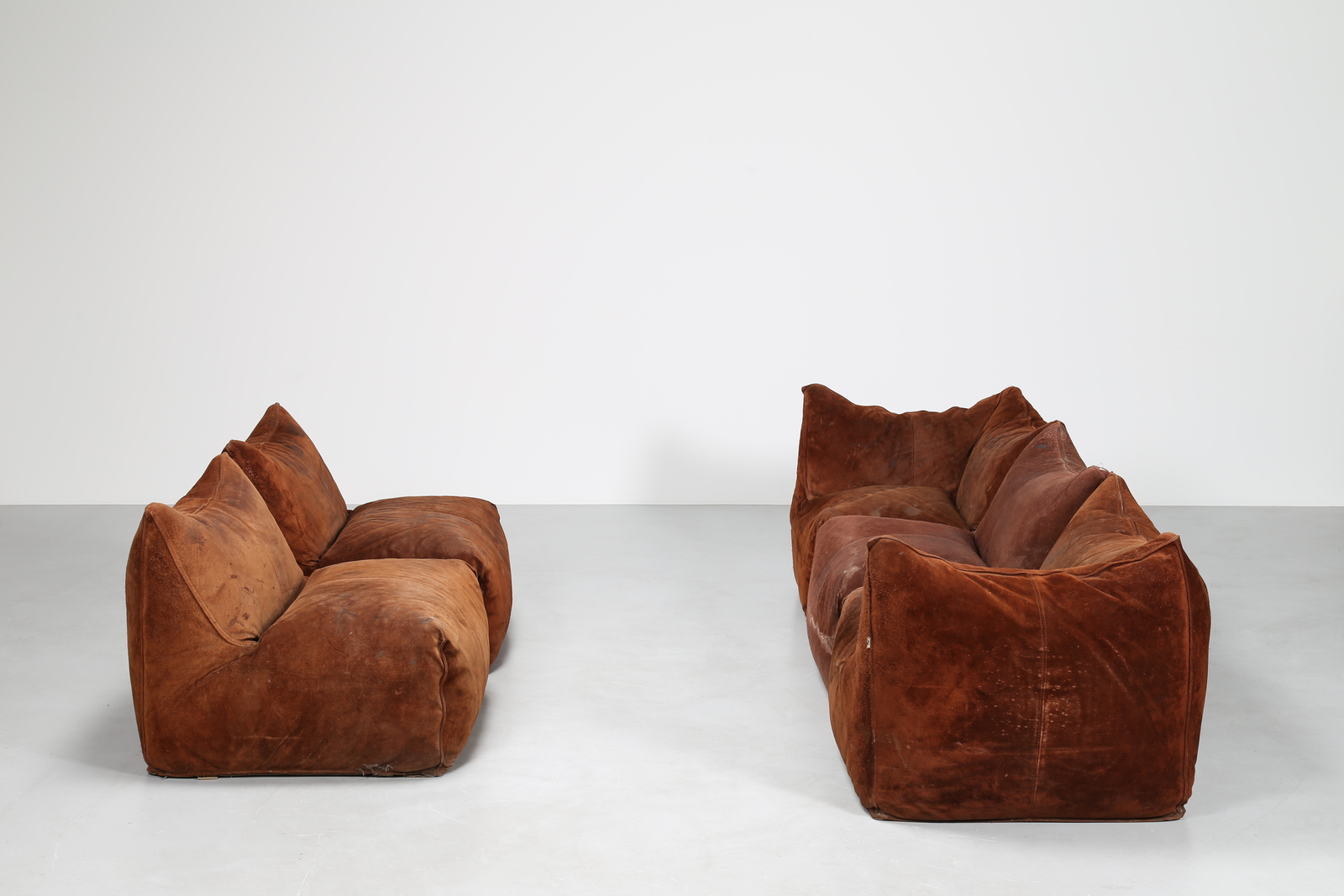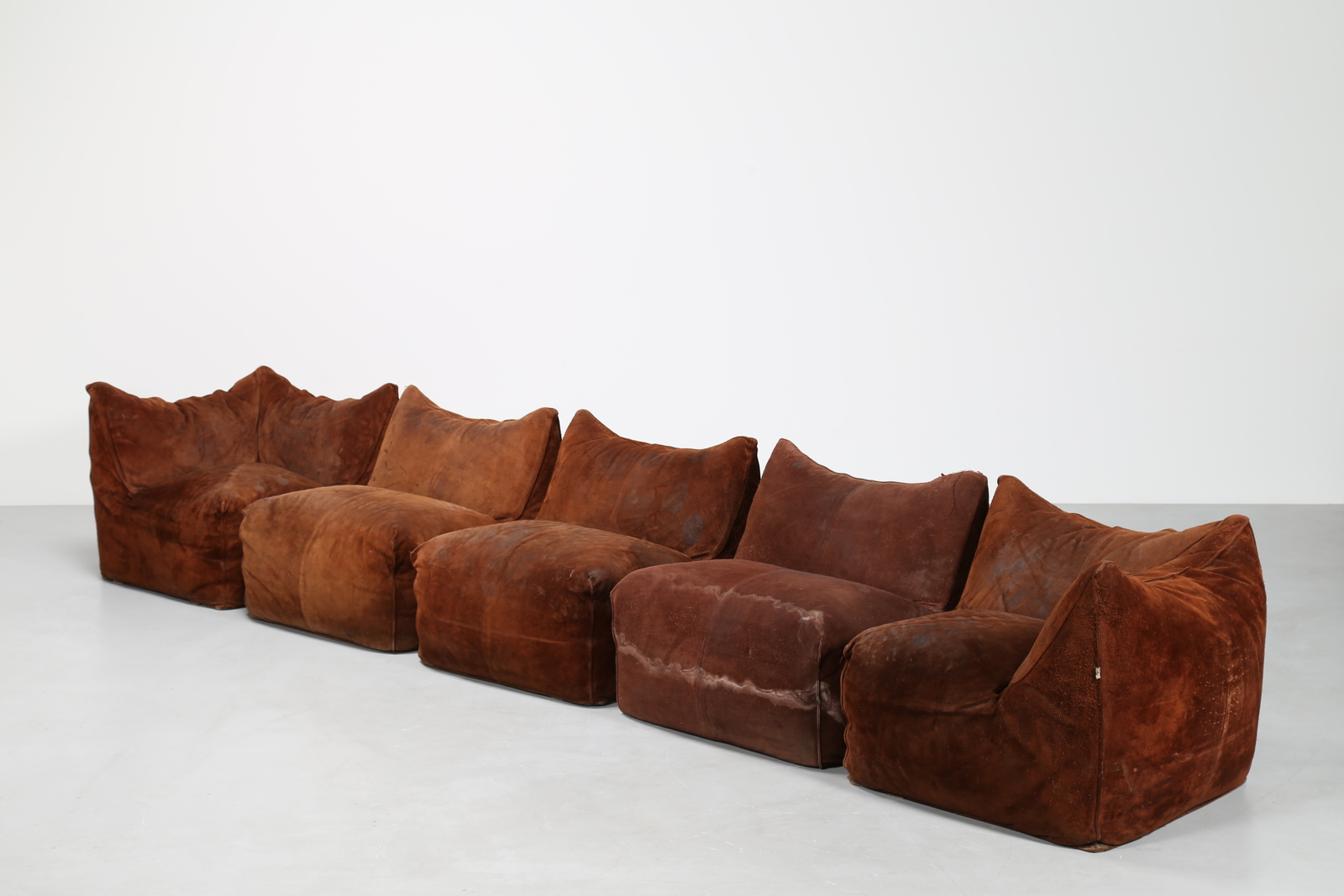 BELLINI MARIO (n. 1935) Due divani componibili, da tre e due posti in pelle scamosciata originale, mod. le Bambole, per C&B Italia diventata poi B&B Italia, anni 70 . -. Cm 80,00 x 80,00 x 71,00. Misure per singola poltrona, Marchio stampato sotto le poltrone,