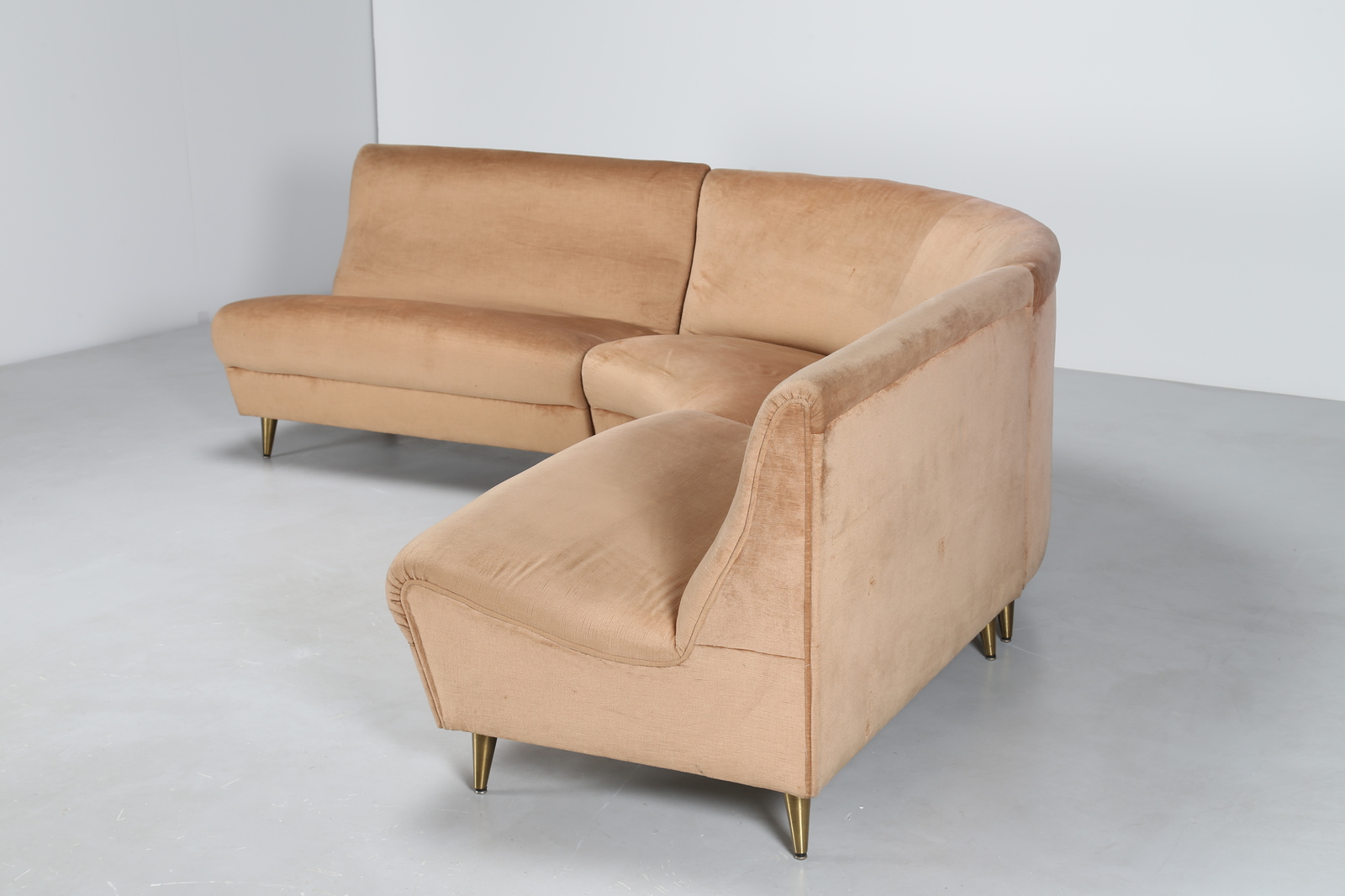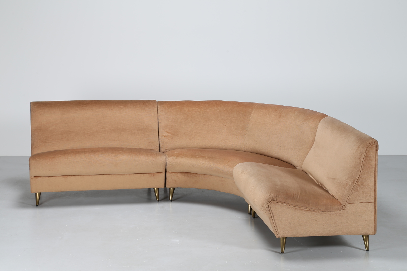 MANIFATTURA ITALIANA Divano componibile curvo con piedini in ottone e rivestimento in velluto, anni 50 . . Cm 230,00 x 76,00 x 230,00.