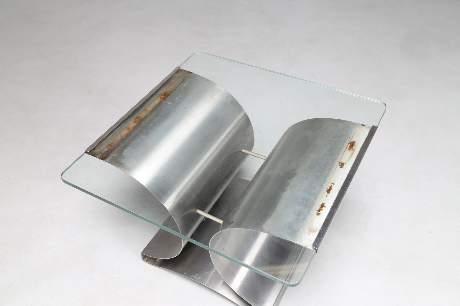 MONNET FRANCOIS Attrib. avolino da caffè in acciaio sagomato e piano in vetro, per Kappa, anni 70 . -. Cm 59,50 x 42,00 x 60,00.