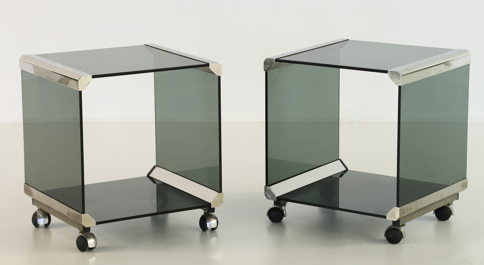 RADICE GIGI Coppia di comodini tavolini in vetro e metallo cromato con ruote. anni 70. Metallo cromato e vetro. Cm 43,00 x 49,00.