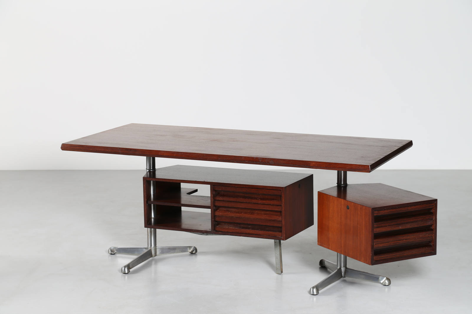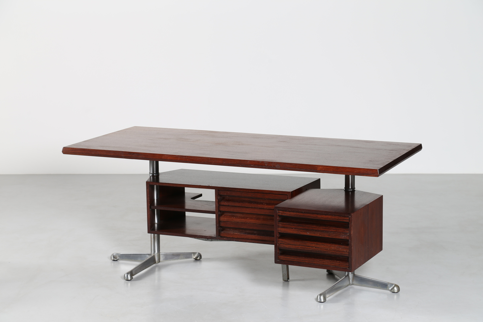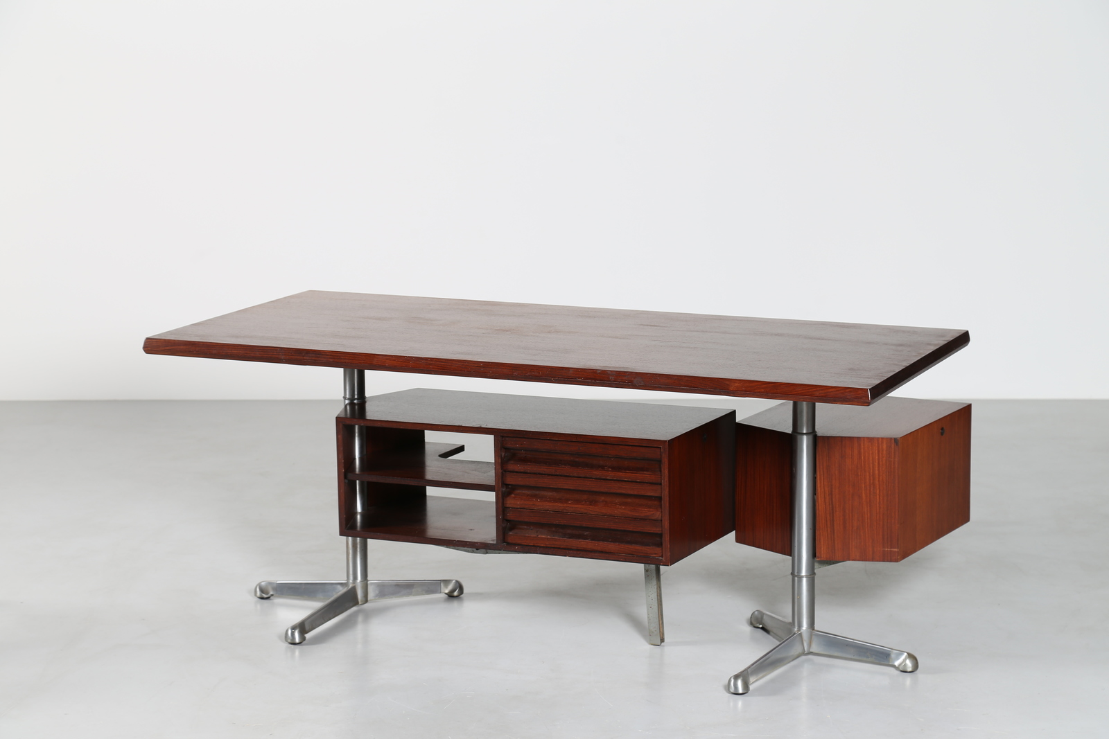BORSANI OSVALDO (1911 - 1985) Scrivania in palissandro, acciaio, alluminio lucidato, cassettiere intercambiabili applicate alla struttura, mod. T95 Prod. Tecno, 1956 . -. Cm 180,00 x 76,00 x 85,00. Etichetta Tecno sulla struttura