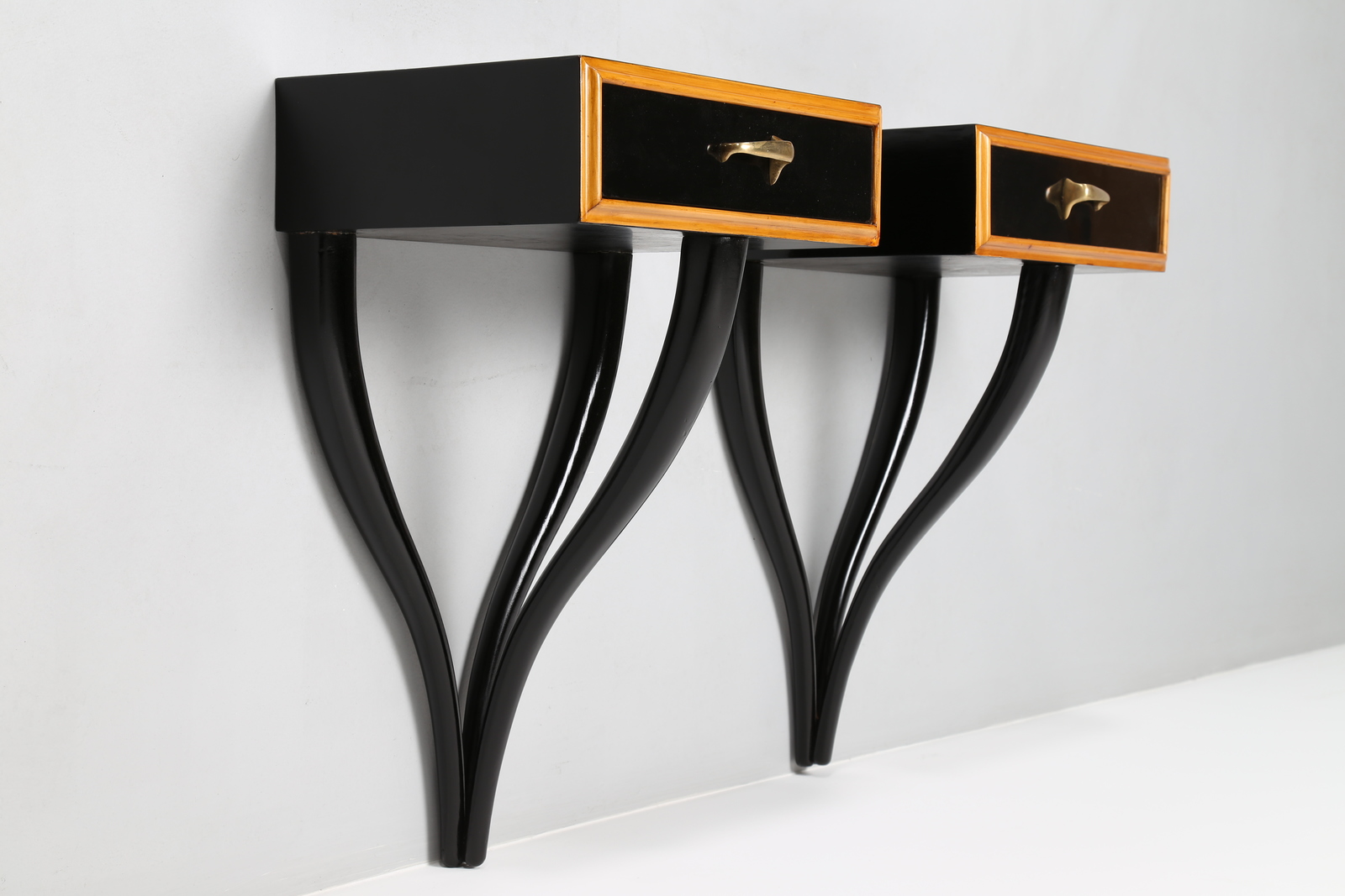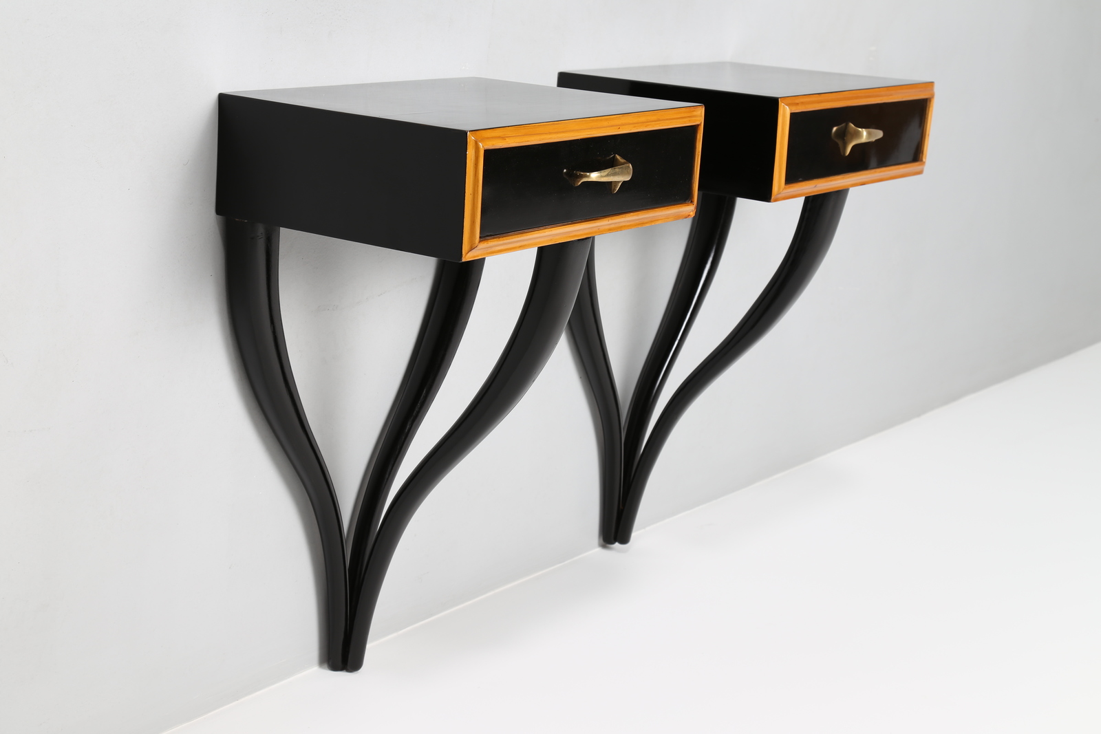 MANIFATTURA ITALIANA Coppia di comodini in legno ebanizzato nero e maniglie in ottone, anni 50. -. Cm 46,00 x 70,00 x 36,00.
