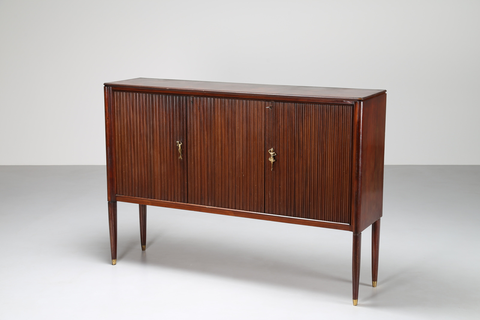 BUFFA PAOLO (1903 - 1970) Mobile credenza in noce grissinato. con maniglie e puntali in ottone, anni 50. . Cm 179,00 x 125,00.