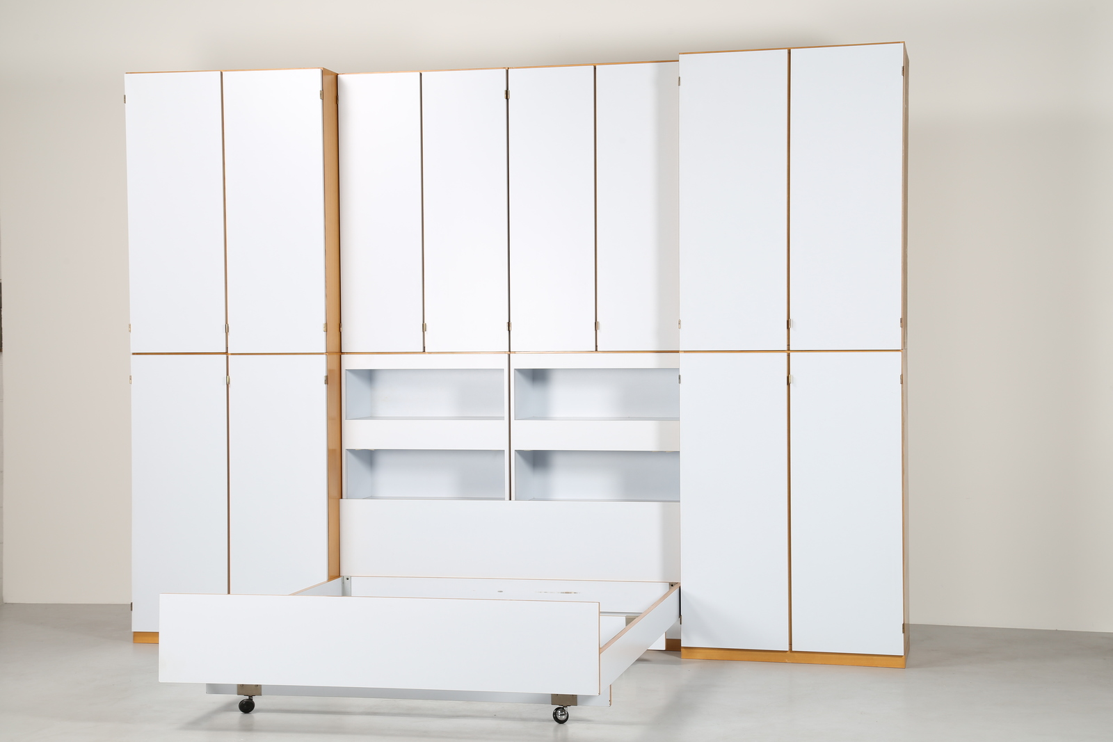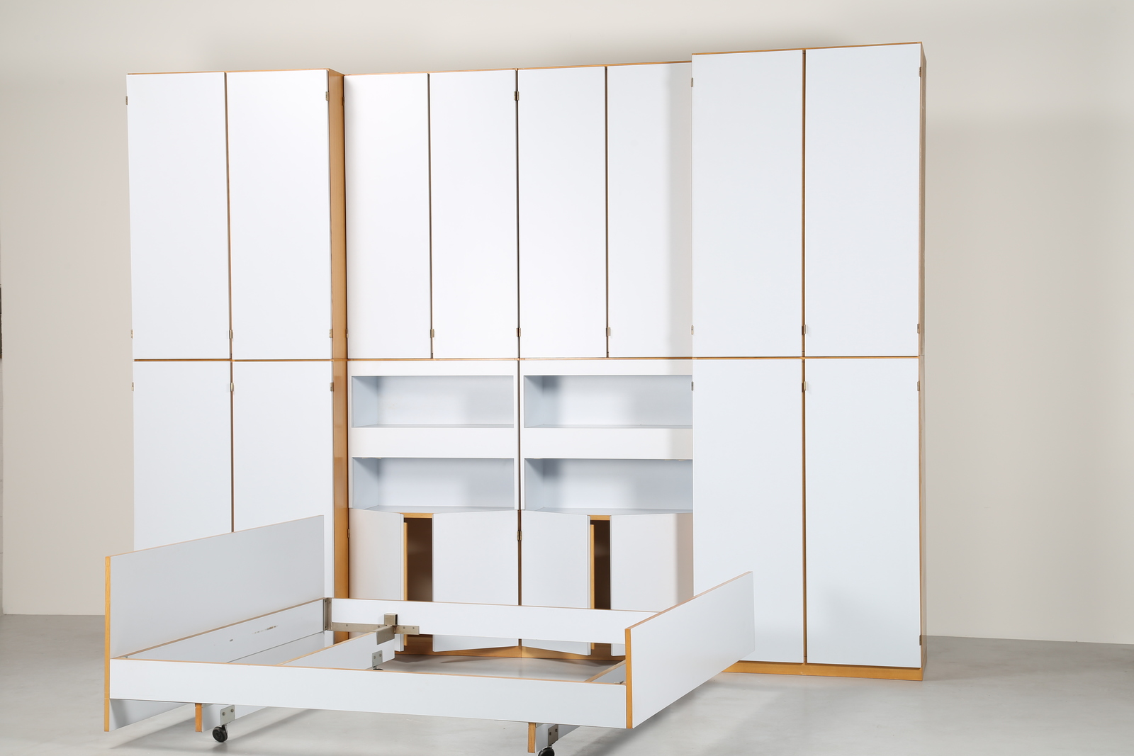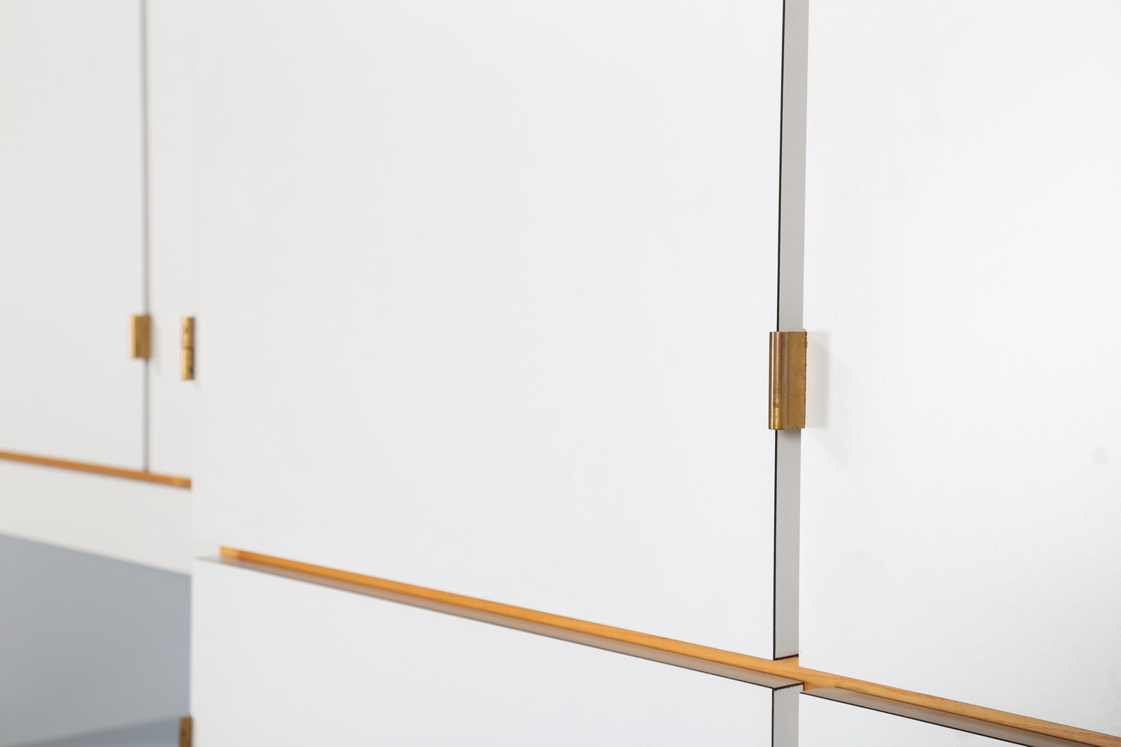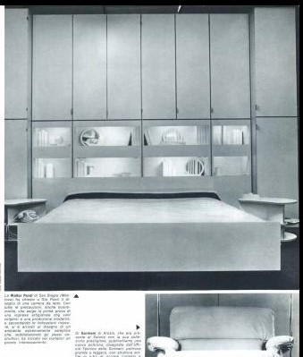 PONTI GIO' (1891 - 1979) Camera da letto in laminato bianco e ottone, serie APTA Per Walter Ponti anni 60, Pubblicazioni; Domus num. 468 11/1968 pag. 87 . . Cm 369,50 x 276,00 x 61,00. Misura letto: 70,5x169x202,5