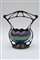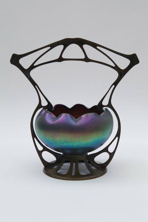 Una coppa di vetro iridescente montata su struttura di ottone,