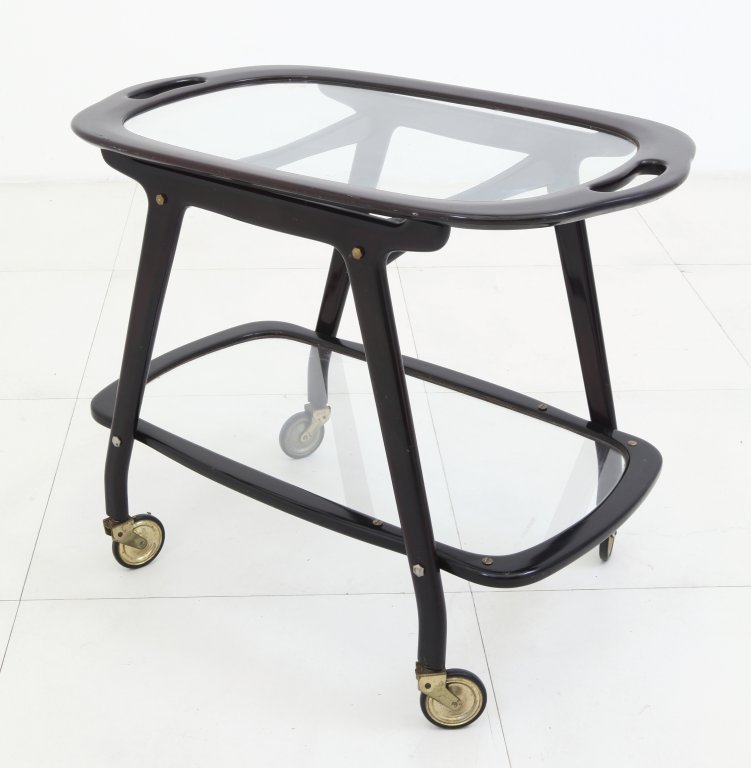 UN CARRELLO, anni "50. Legno di mogano, cristallo, vassoio superiore...