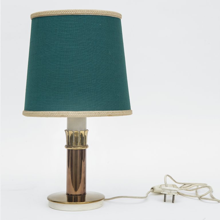 Lacquered aluminum, oxidized brass, and elliptical material shade,