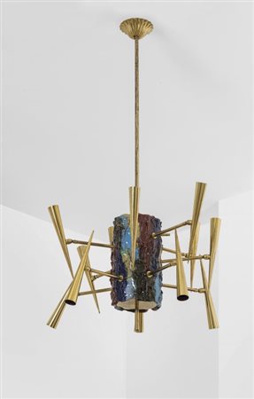 LEONCILLO LEONARDI Un lampadario, anni'50. Ceramica, ottone. Altezza cm 110,...