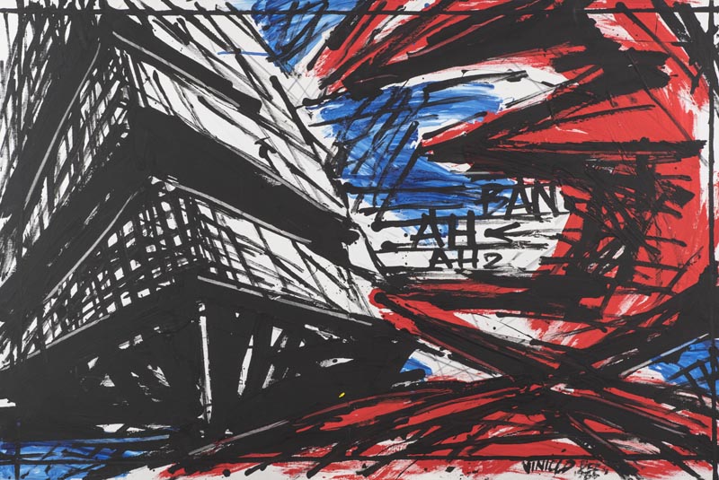 Vinicio Berti (Firenze 1921 - 1991) Antagonismo Positivo AH BAN, 1986 Tempera sintetica su tela, cm. 80x120 Firma e data in basso a destra; Sul verso: firma e titolo.