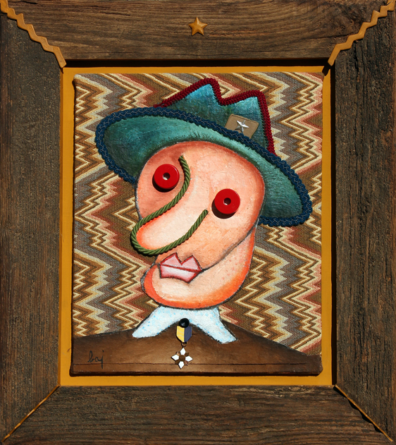 Enrico BAJ (Milano 1924-Vergiate 2003) Uomo con cappello, 1973, collage e tecnica mista su tavola, cm. 55 x 45, AA.VV. 'Catalogo Generale delle Opere di Enrico Baj dal 1972 al 1196', Coedizione Marconi-Menhir, Milano, La Spezia, 1997, p.223, n. 1936, Nella pubblicazione dell'opera la data risulta errata #Firma 'Baj' (in basso a sinistra) Autentica dell'artista su fotografia