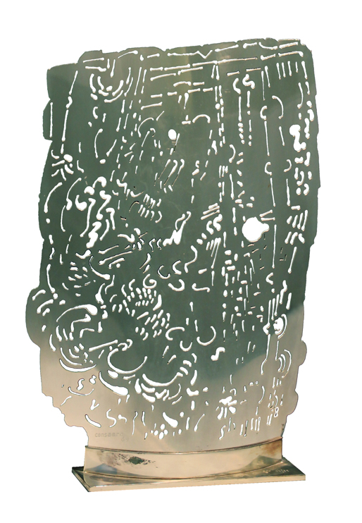 Pietro CONSAGRA (Mazara del Vallo, 1920-Milano, 2005) Intercontinentale, 1969, metallo argentato, cm. 43.5 x 30 x 5.5, 'Arti visive', Rivista trimestrale autunno 1973, p. 103, Edizione di 50 esemplari #Firma, data 'Consagra, 69' (in basso a sinistra); #numerazione '13/50' (sulla base) Autentica dell'artista su fotografia