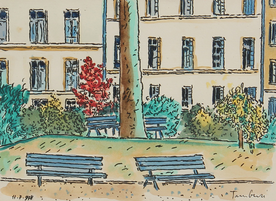 Orfeo TAMBURI (Jesi 1910-Parigi 1994) Case di Parigi, 1978, china colorata su cartoncino, cm. 20 x 29, Data '11.7.978' (in basso a sinistra); #firma 'Tamburi' (in basso a destra) Autentica dell'artista su fotografia