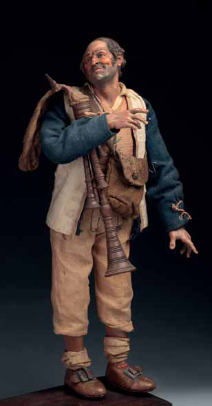 Pastore (guardiano delle capre) mirante a destra, di Nicola Somma (prov. collezione Catello), rustico trasformato successivamente in zampognaro, indossante un gilet imitante la pelle di agnello sopra una giacca blu. Altezza cm 36, fine secolo XVIII Accessori: bisaccia in pelle, zampogna
