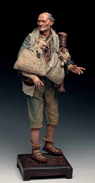 Zampognaro con pipa, di Lorenzo Mosca, (prov. collezione Agresti), pastore abruzzese di mezza età, calzato con ciocie, con al collo doppia bisaccia dalle quali fuoriescono le teste di un agnello e di un capretto. Altezza cm 33; fine secolo XVIII Accessori: Zampogna, doppia bisaccia