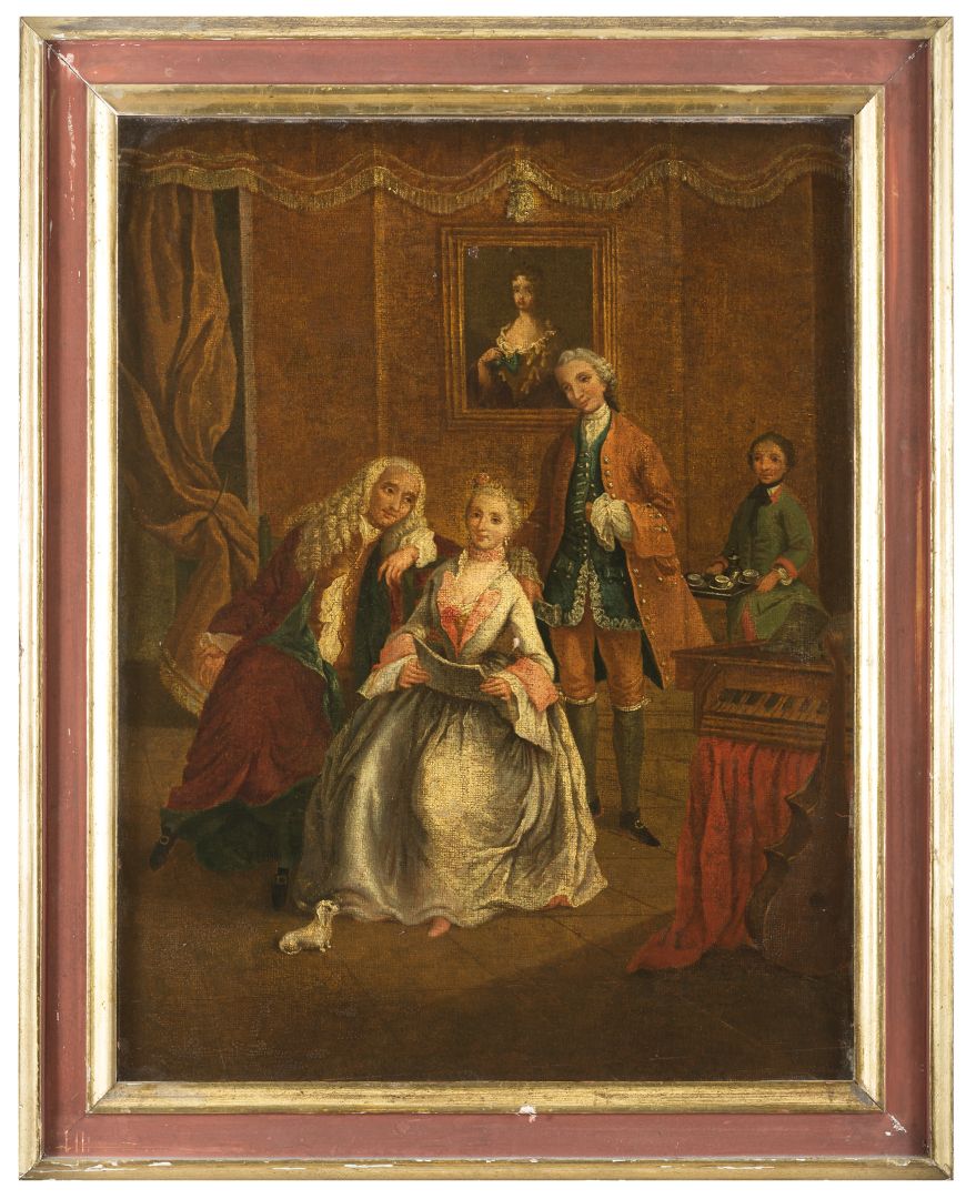 PITTORE INGLESE DEL SETTECENTO Interno con figure Olio su tela cm 62 X 47,5