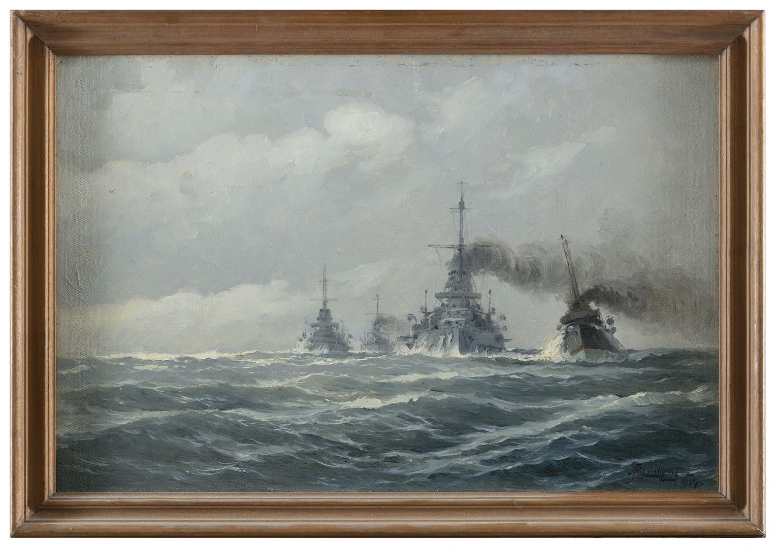 PITTORE DI POLA FINE OTTOCENTO Navi da guerra 1914 Olio su tela applicata su...