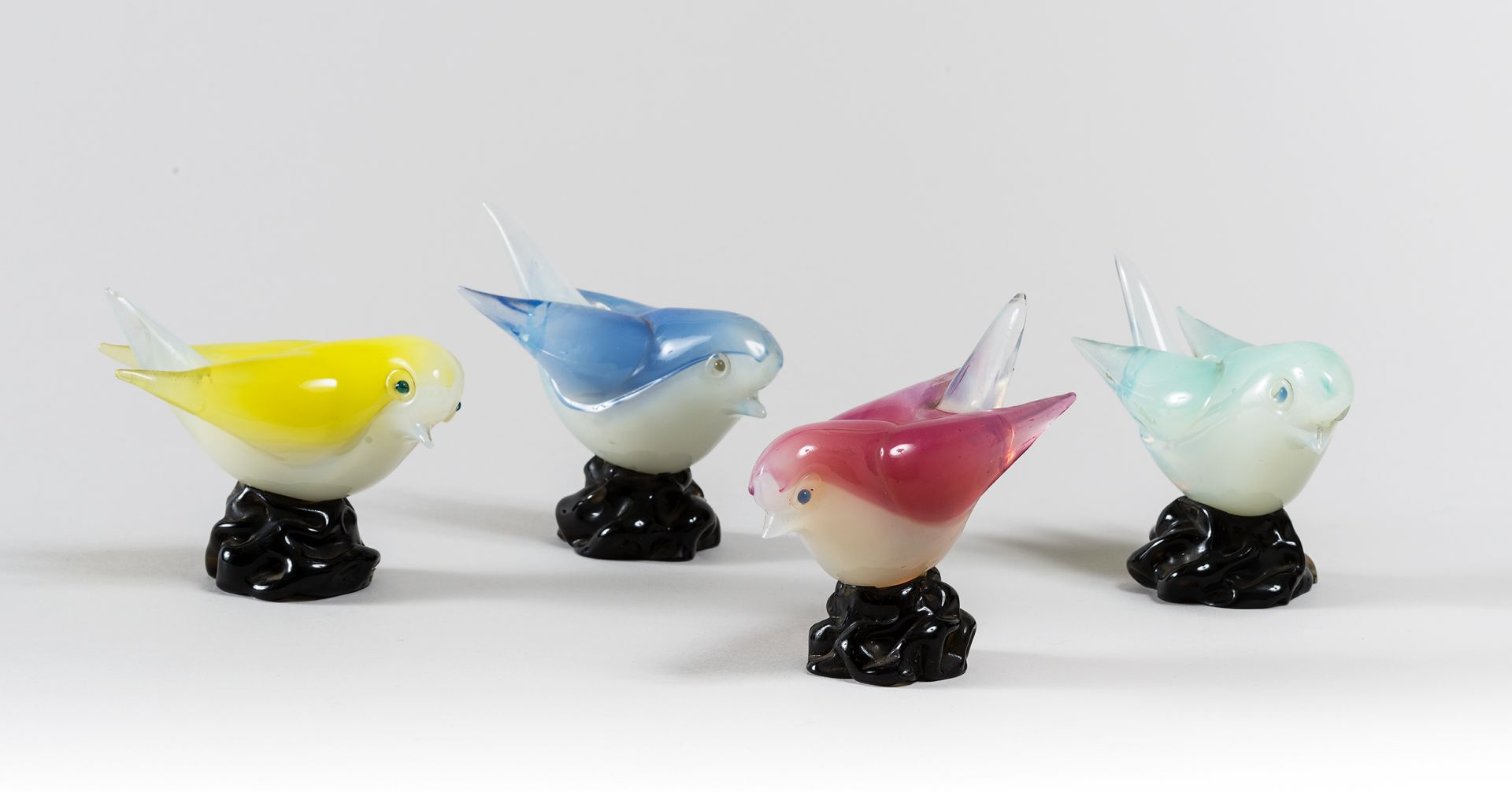 QUATTRO UCCELLINI IN VETRO Multicolore Murano anni '40 Misure cm 10 x 13...