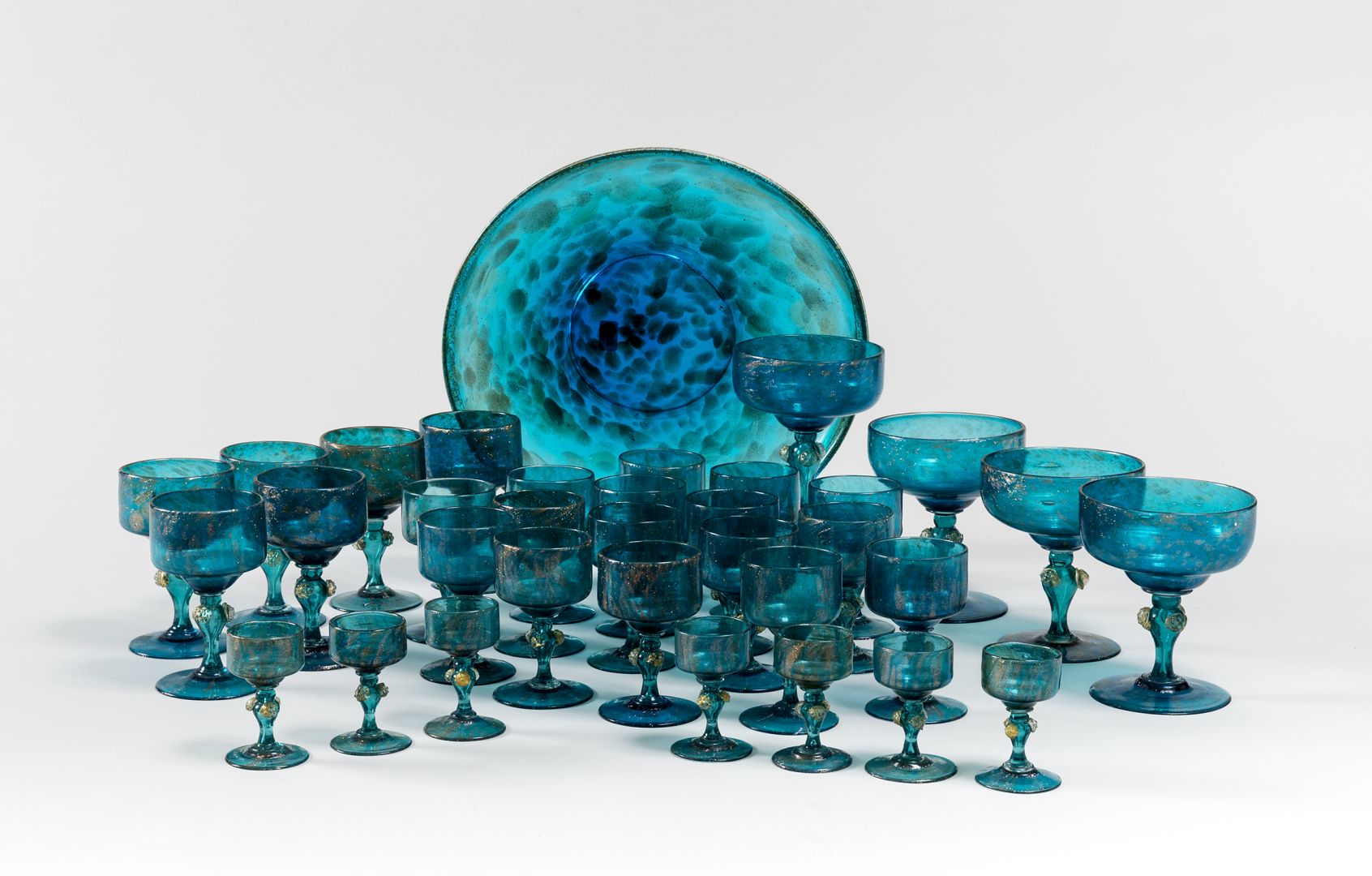 SERVIZIO DI BICCHIERI IN VETRO Azzurro a calice con inserti a polvere d'oro...