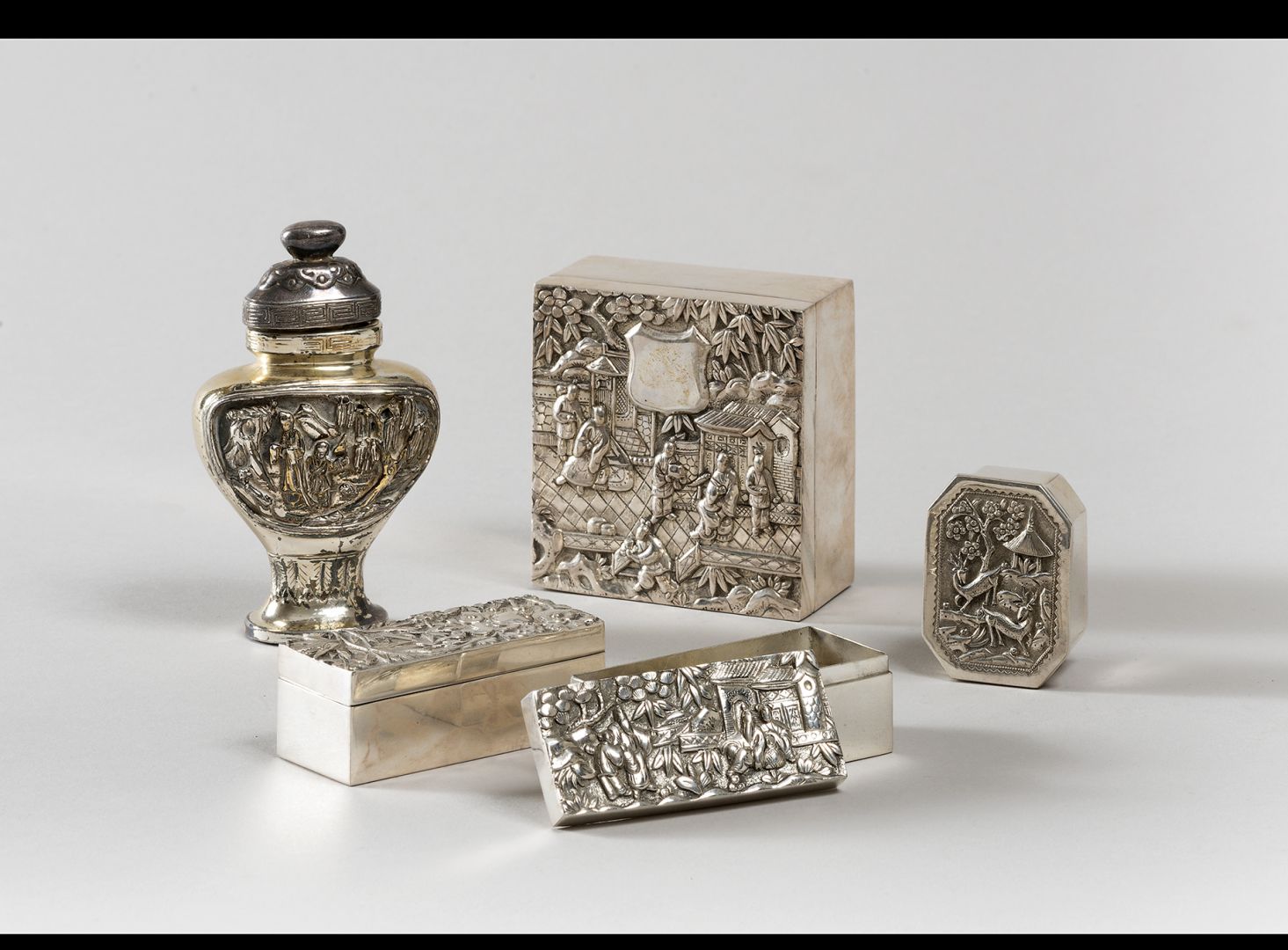 QUATTRO SCATOLETTE IN ARGENTO CINA ANNI '30Â Scene di genere eseguite a...