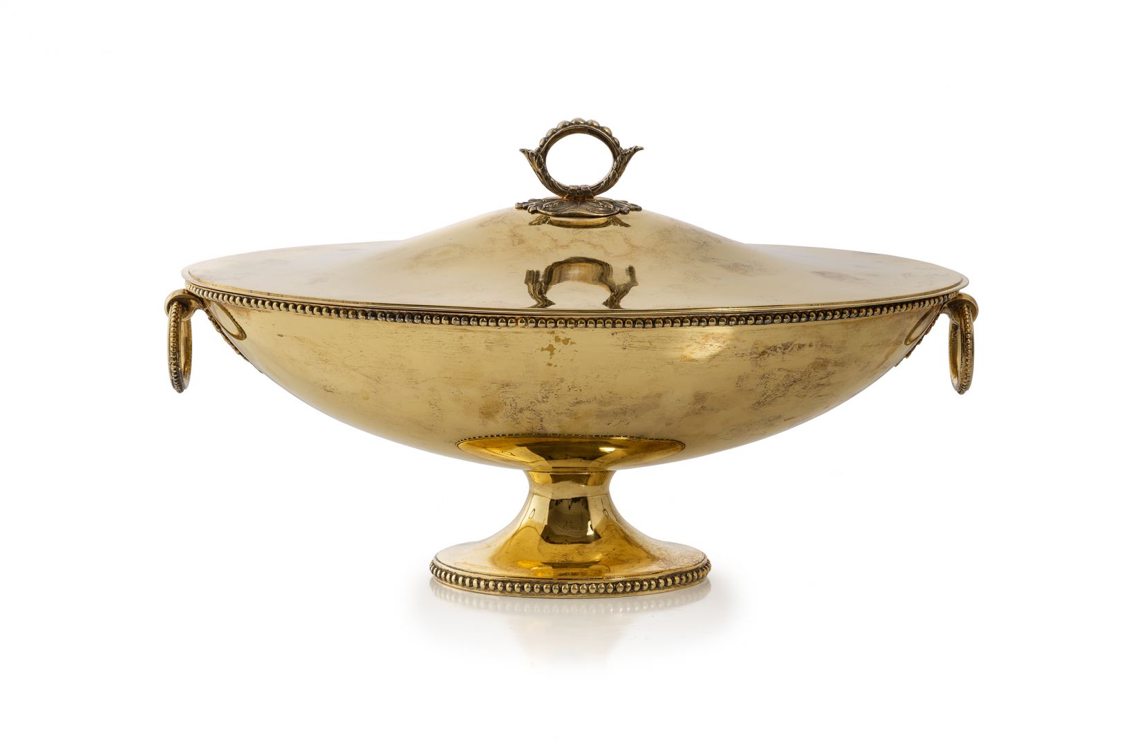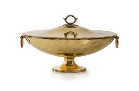 GRANDE CENTRO TAVOLA IN ARGENTO DORATO A forma di coppa ovale con prese...