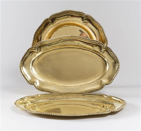 TRE PIATTI IN ARGENTO PLACCATI ORO Uno tondo con bordo mosso e cordonato con...