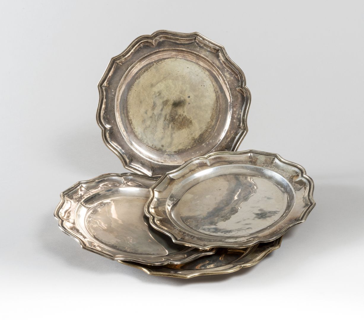 QUATTRO PIATTI IN ARGENTO Bordi sagomati a balestra punzone nobiliare sul...