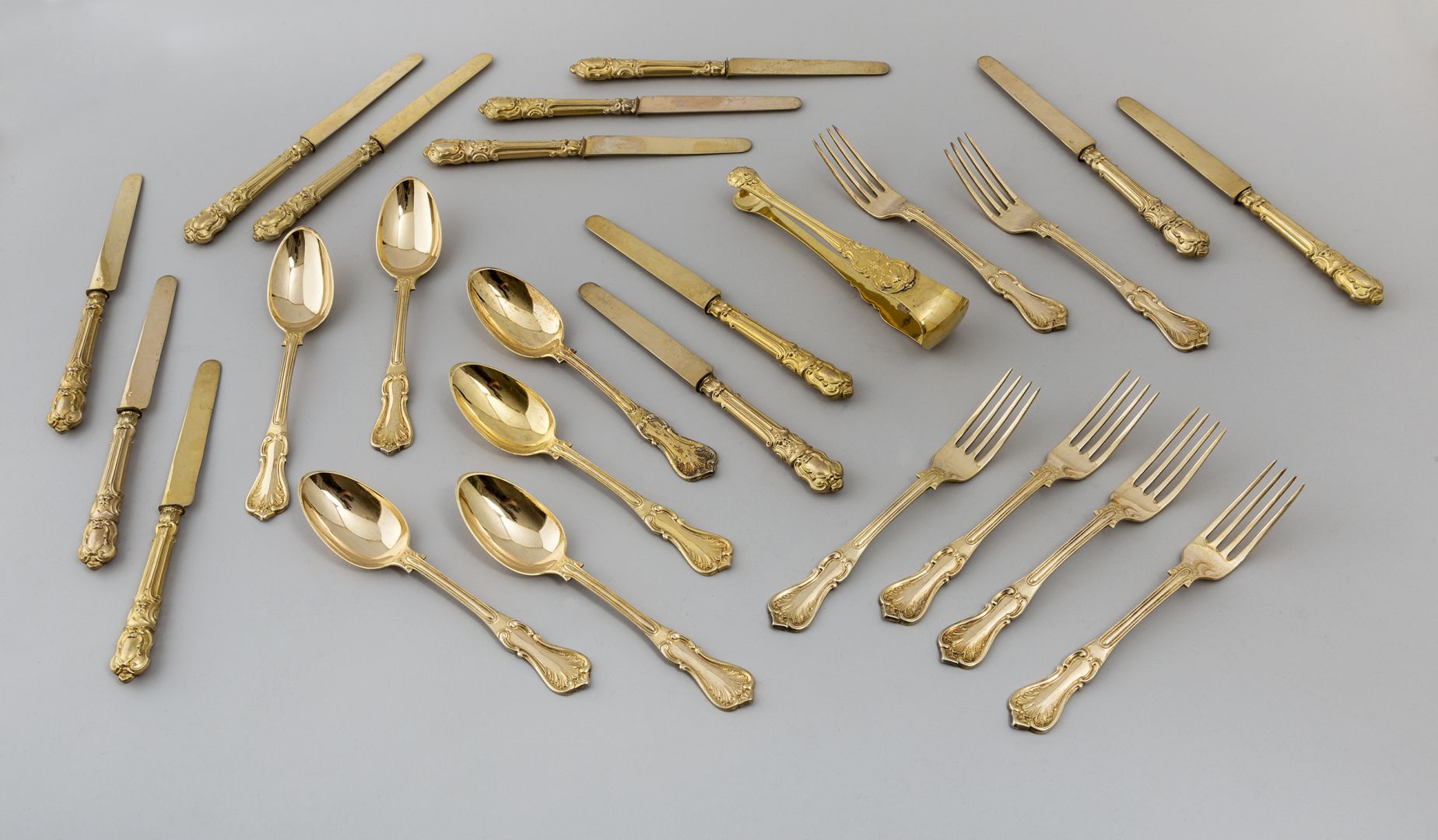 POSATE IN ARGENTO DORATO Comprendenti sei forchette, sei cucchiai dodici...