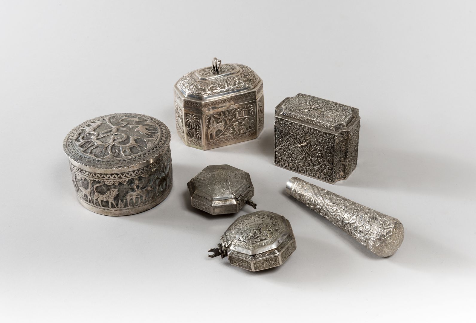 CINQUE SCATOLE ORIENTALI IN ARGENTO E UN POMO PER BASTONE IN ARGENTO