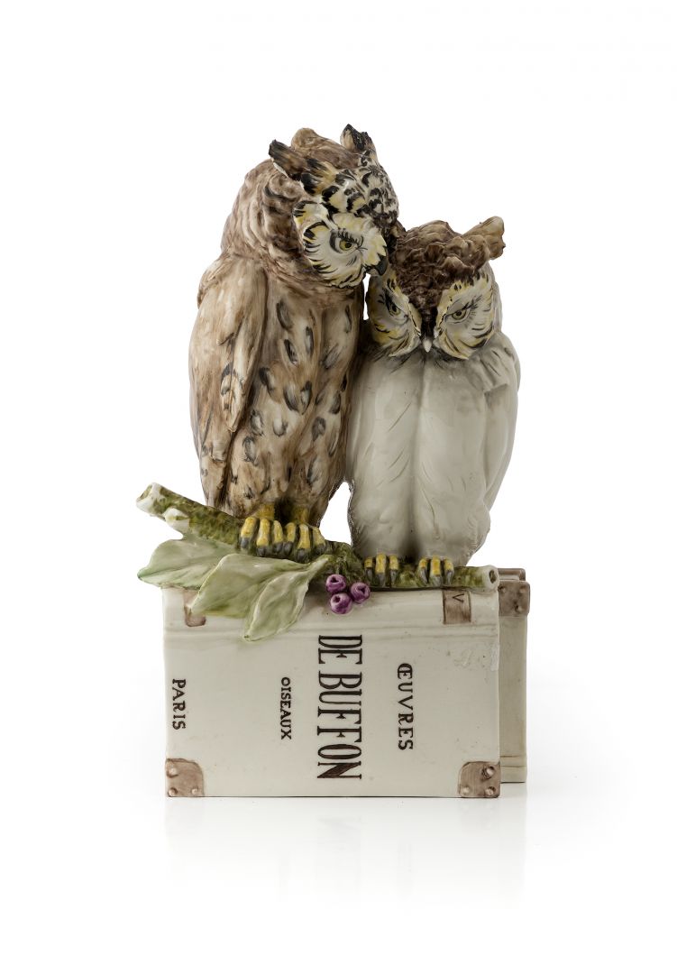 CERAMICA CACCIAPUOTI Gufi su libro con scritta Oeuvres De Buffon Oiseaux...