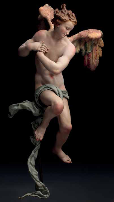 Angelo nudo, capolavoro di Giuseppe Sammartino. Questa celebre “Accademia”, ben nota nell’ambiente dei collezionisti napoletani, unisce alla perfezione anatomica uno straordinario senso del movimento di torsione. I capelli piuttosto lunghi e ondulati lasciano scoperto il volto, spinti in alto e all’indietro, dando l’impressione che il nostro Angelo stia velocemente scendendo verso la scena della Natività. Alla oggettiva bellezza dell’opera scultorea, va considerato l’ulteriore pregio aggiunto della prestigiosa provenienza, il Presepe di Leopoldo di Borbone principe di Salerno. Altezza cm 35; seconda metà secolo XVIII Accessori: bacheca con cappuccio in cristallo dei primi anni del Novecento