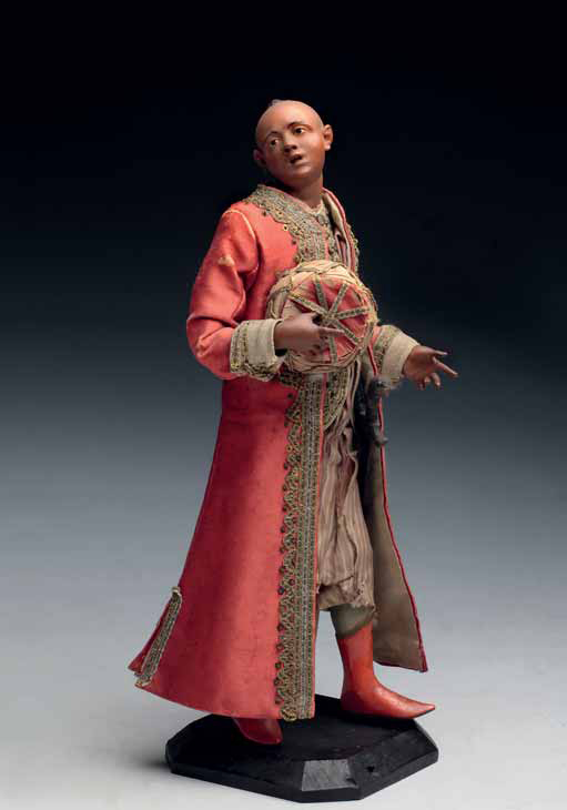 Giorgianello, di Giuseppe Gori, (prov. collezione Scuotto), dal lungo cappotto rosso gallonato che copre i pantaloni a sottili fasce rosse e avorio, il capo rasato salvo il codino all’orientale. Altezza cm 25; fine secolo XVIII Accessori: cappello a turbante